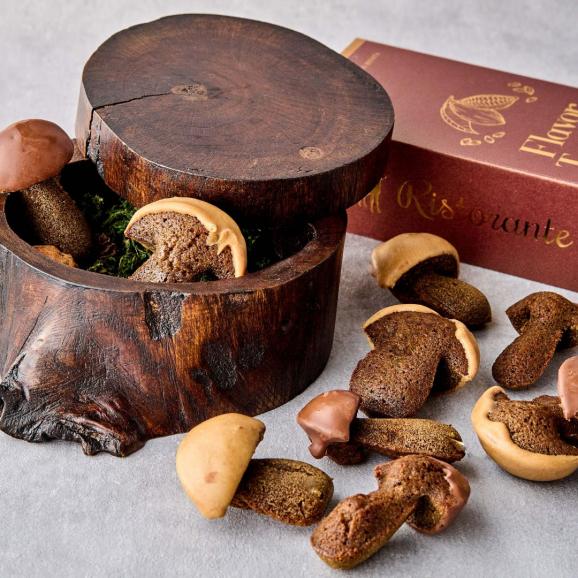 1口目はかさのチョコレートコーティング部分を召し上がり、チョコとポルチーニの香りをお楽しみください。2口目に軸の部分を召し上がり、ポルチーニとバターの香りをお楽しみください。