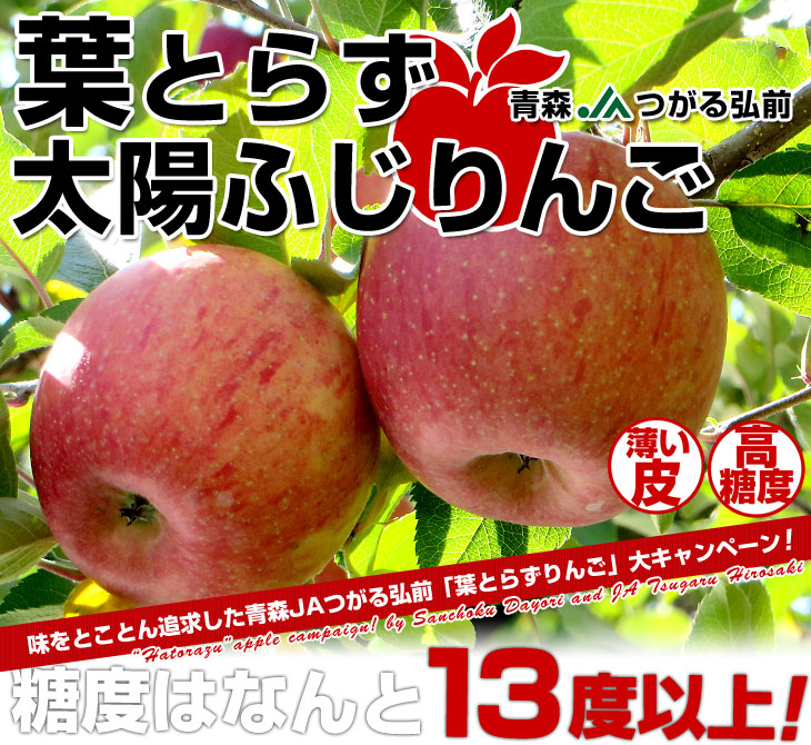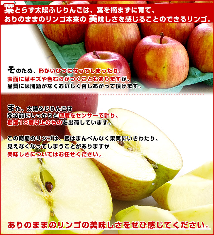 糖度はなんと13度以上!大人気の葉とらず太陽ふじ。見た目にこだわらず、味重視で育てた葉とらず太陽ふじは、葉を取らないで育て、シャッキと美味しいリンゴを選別してます。多少の色ムラや品質に影響のない小さなキズが入りますが、とっても美味しいのが自慢です。