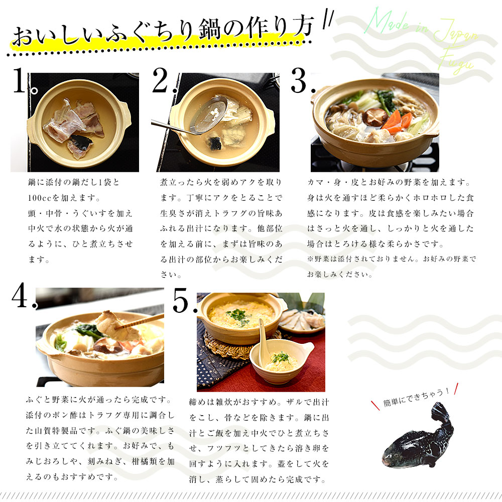 内容量:トラフグちり 400g 鍋だし 55g ポン酢 250ml もみじおろし 20g(5g×4個)