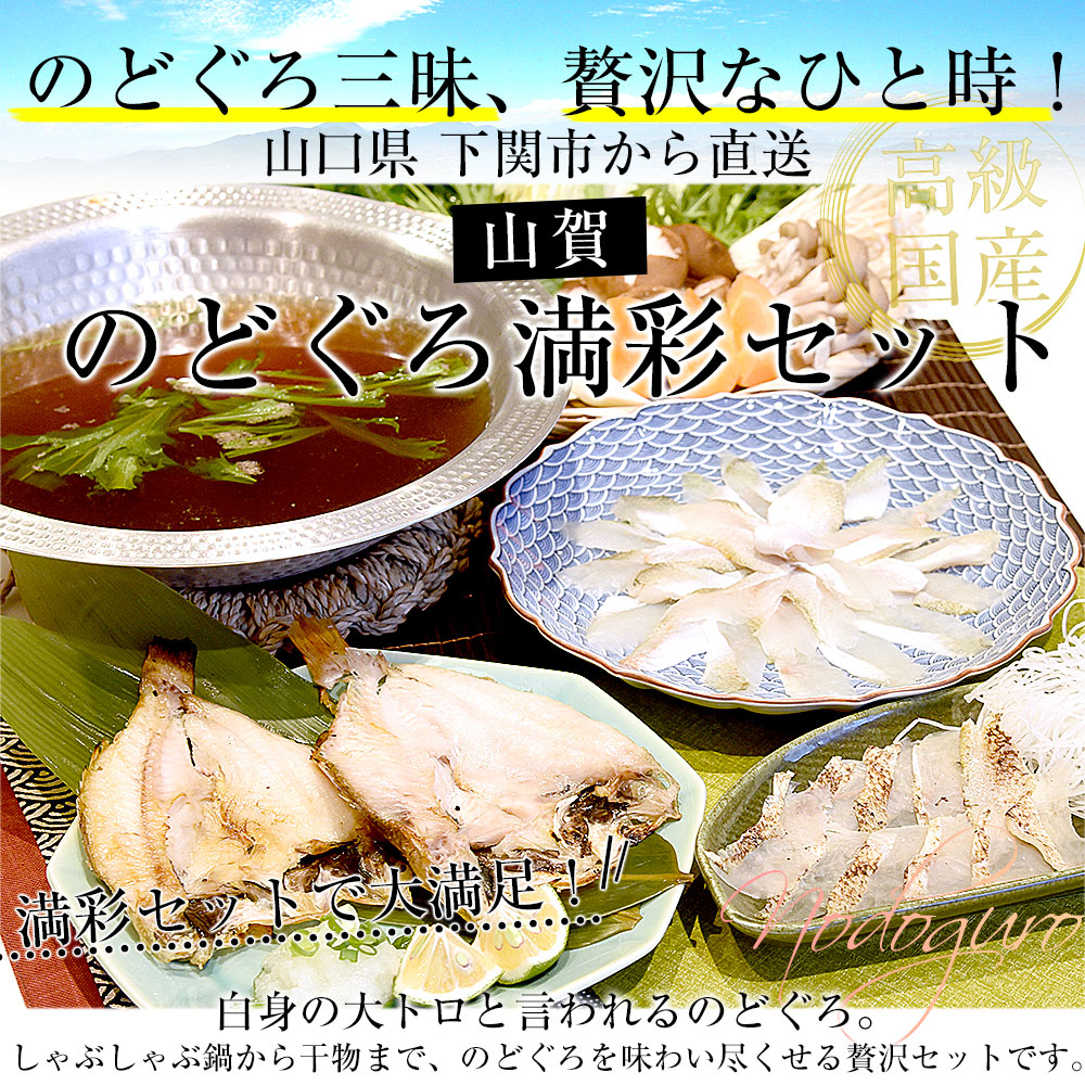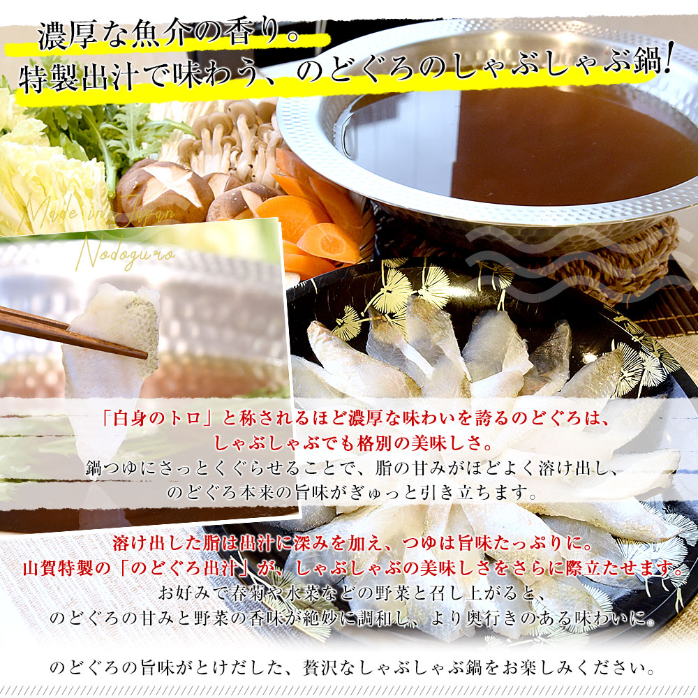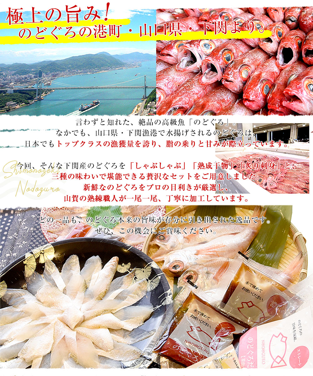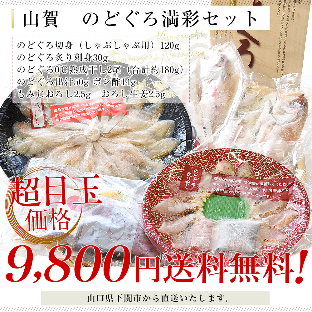 原材料名:【のどぐろ切身・炙り刺身】のどぐろ(アカムツ)【のどぐろ開き】のどぐろ、食塩【のどぐろだし】のどぐろスープ、醤油、発酵調味料、醸造調味料、昆布エキス、食塩(一部に大豆・小麦を含む)【のどぐろだし(鍋用)】のどぐろスープ、醤油、発酵調味料、醸造調味料、昆布エキス、食塩、帆立エキス、たん白加水分解物(一部に大豆・小麦を含む)【ぽん酢】醤油、砂糖、醸造酢、ゆず果汁、日向夏みかん果汁、昆布エキス、かつお節エキス、酵母エキス/調味料(アミノ酸等)甘味料(甘草)(一部に大豆・小麦を含む)【もみじおろし】大根、唐辛子/アルコール、酸味料、モナスカス色素、増粘剤、香辛料抽出物【おろししょうが】しょうが、食物繊維、醸造酢/増粘剤