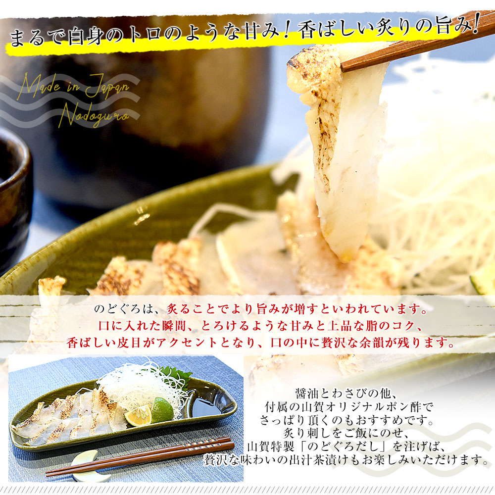 内容量:のどぐろ切身120gのどぐろ炙り刺身30gのどぐろ0℃熟成干し2尾(合計約180g)のどぐろ出汁50gポン酢14gもみじおろし2.5gおろし生姜2.5g