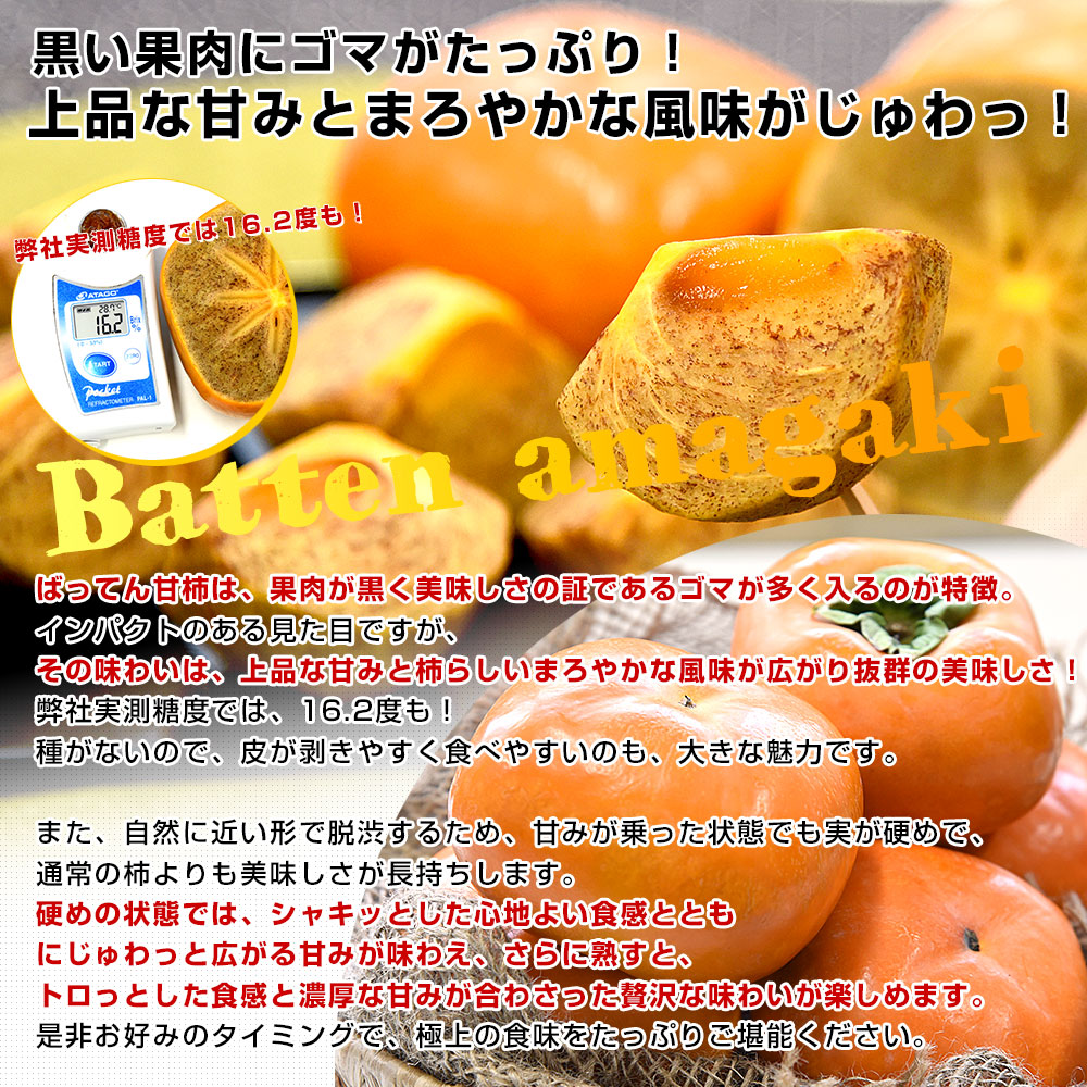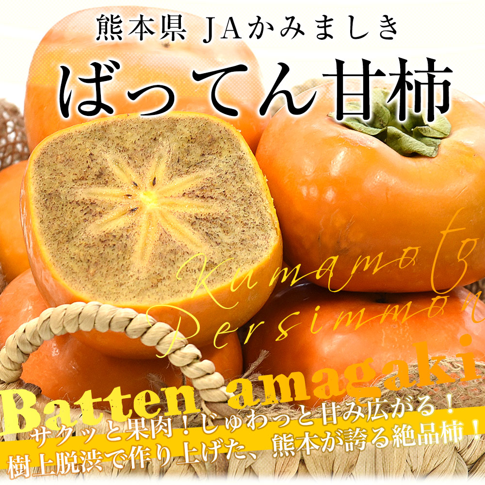 樹上脱渋で作り上げた、熊本が誇る秋の極旨柿「ばってん甘柿」を産地直送でお届け!樹上で一玉ずつ袋をかけて脱渋した柿は、甘み豊かでとっても美味!種なしで食べやすく、果肉は黒く、美味しさの証であるゴマが入ります。ご家庭用は、外観にスレキズが入りますが味は上位等級と同じです。