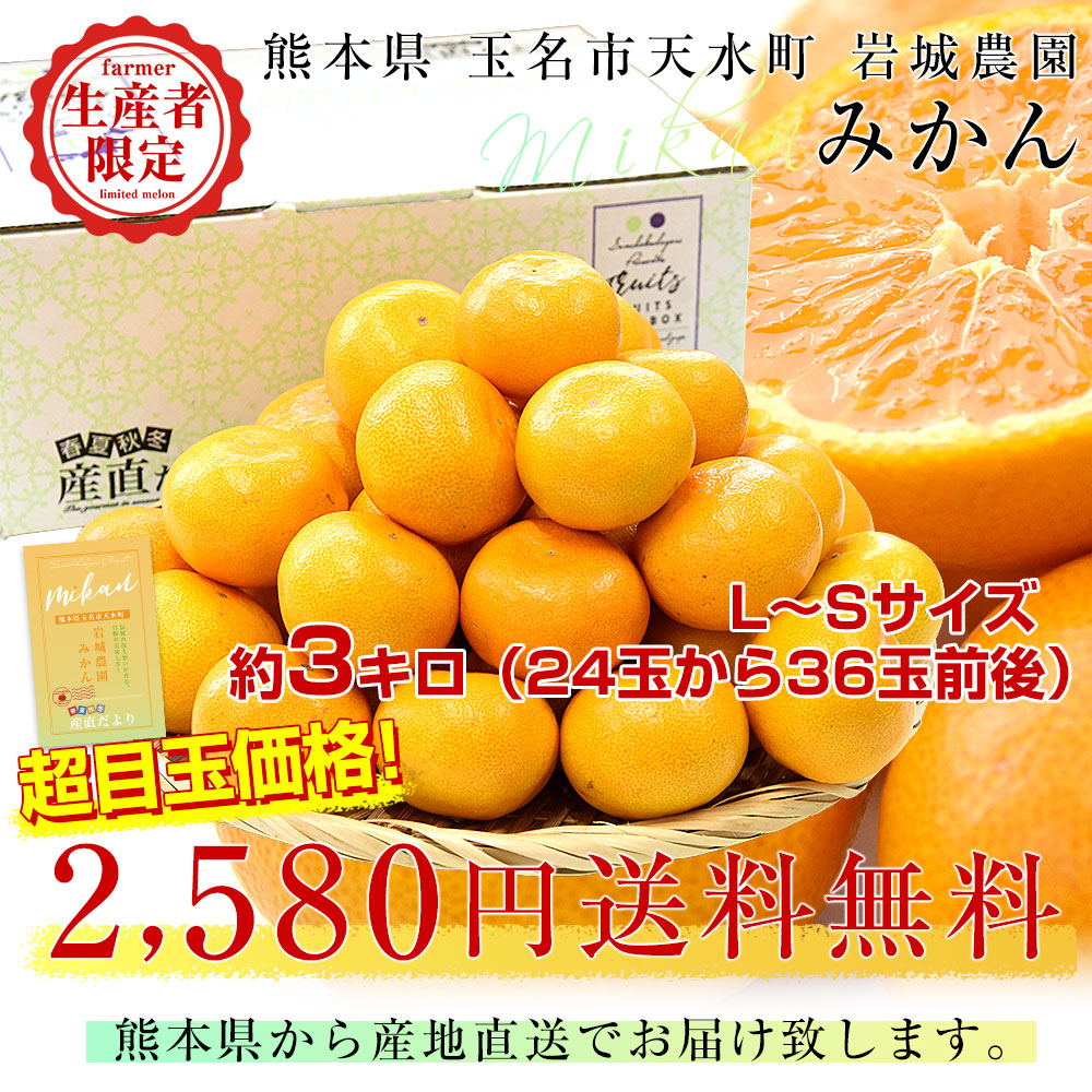 熊本県天水町・岩城農園こだわりのみかんをお届けします。一口食べると、豊かな風味とまろやかな甘みが広がります。果汁はみずみずしく、酸味は控えめなバランスの良い味わいです。五代にわたって続く、生産者の技と愛情が詰まった自慢のみかんをお楽しみください!