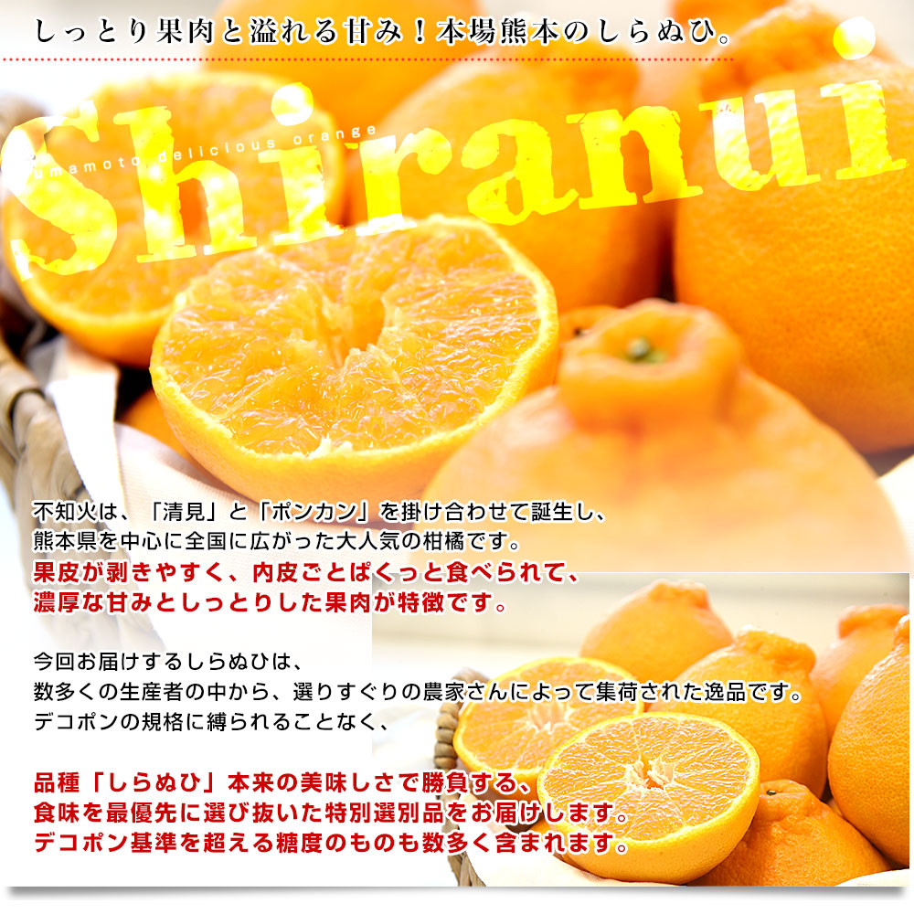 本場熊本から産地直送!極旨のしらぬひをお届けします。しっとりとした果肉に、濃い甘みが凝縮していて、抜群の美味しさです。やはり元祖は違う!と言われる、名産地ならではの高品質なしらぬひを、是非お楽しみください。