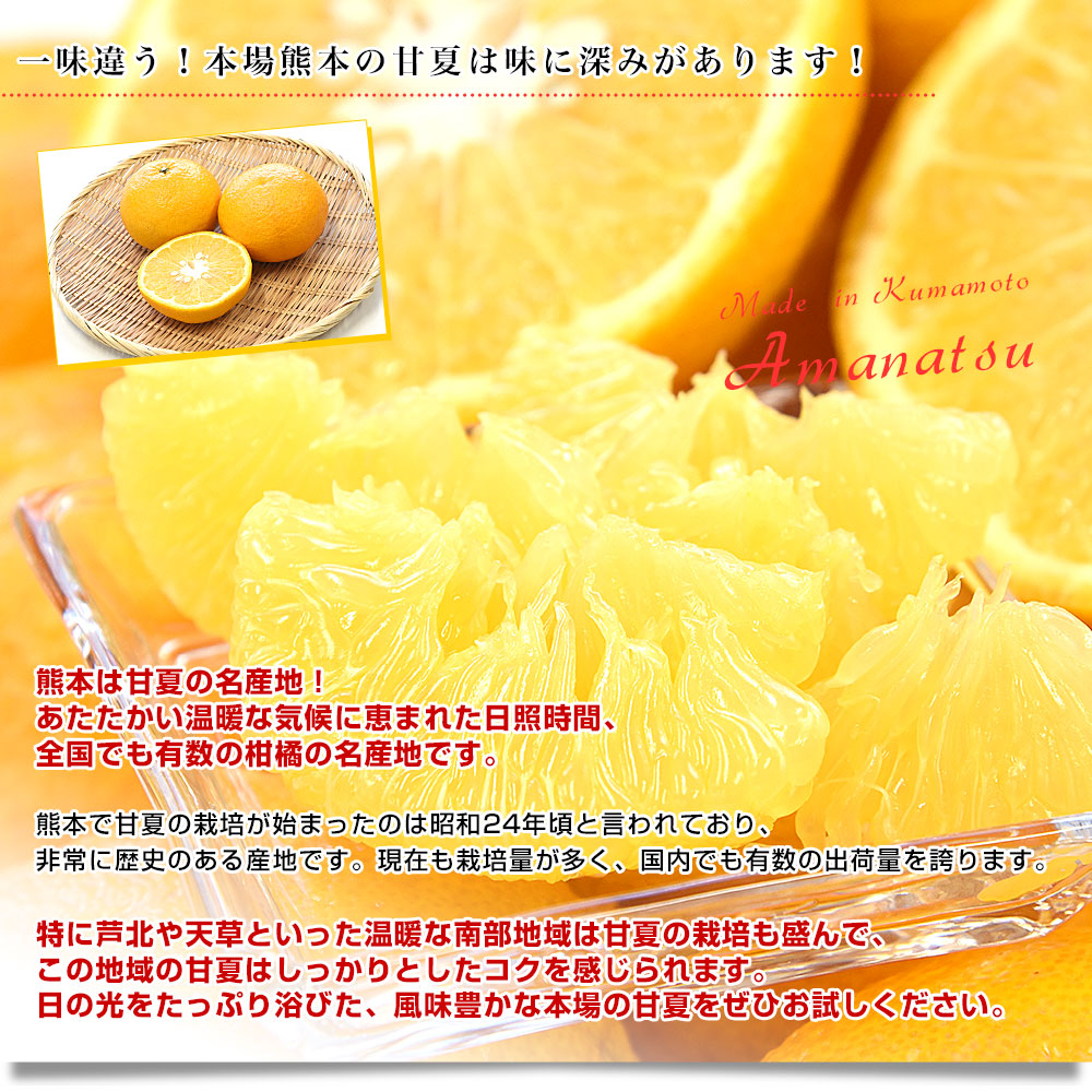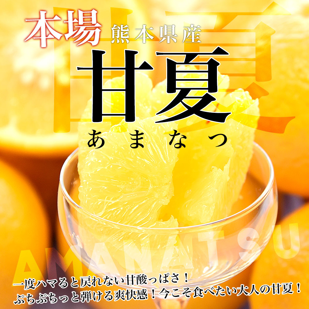 熊本から産地直送!味わいの詰まった甘夏をお届けします。甘夏ならではの、ほろ苦さと甘酸っぱさが重なり、爽やかな風味が口いっぱいに広がります。シャキッ!プチプチッとした果肉は噛むほどにジューシーです。本場の甘夏を是非お試しください。