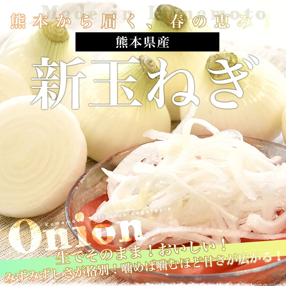 そのまま生で食べておいしい!みずみずしさが自慢の春の恵み!「新玉ねぎ」を熊本県から産地直送でお届けいたします!切った途端、切り口からじんわりと水分がにしむほど、ジューシーな新玉ねぎは、噛めば噛むほど甘さが広がります。スライスするだけで春のごちそうに!春だけのおいしさをぜひお早めにご利用ください!