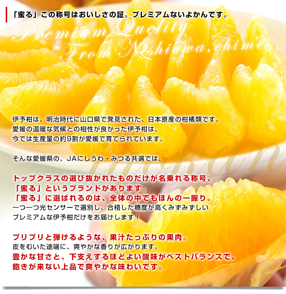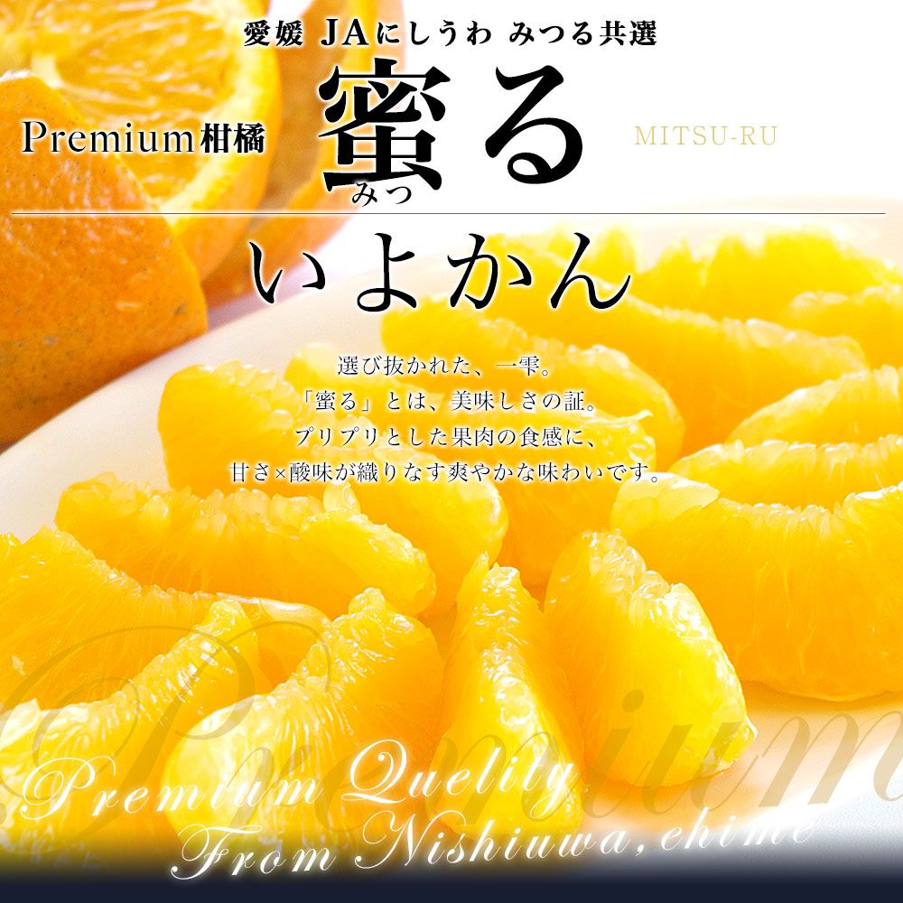 選ばれし一雫!「蜜る」、この称号はおいしさの証!みつる共選のプレミアムないよかんをお届けします。いよかんとは、柑橘界のロングセラー商品。爽やかな甘みと、プリプリとした果肉溢れる食感が楽しめます。「蜜る」に選ばれるのは、全体の中でほんの一握り。甘みと酸味のバランスも良く、飽きの来ない美味しさです。
