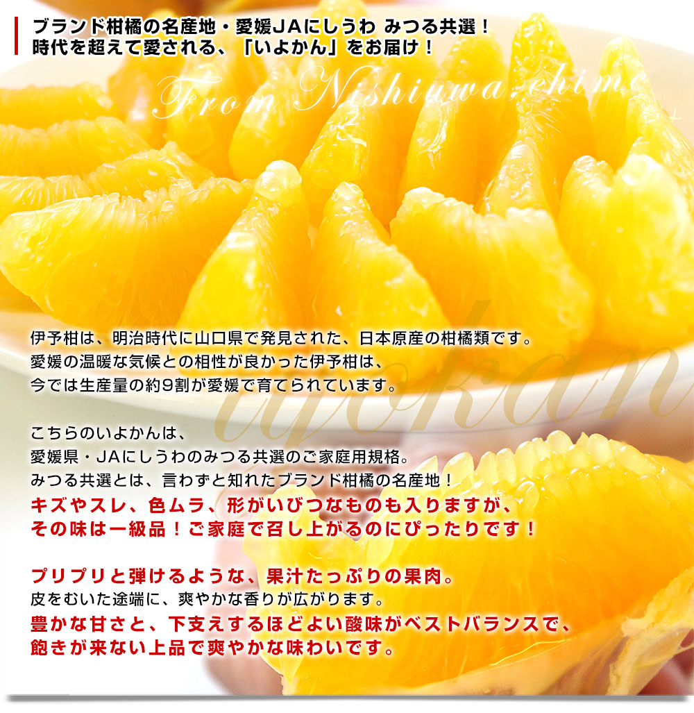 選ばれし一雫!「蜜る」、この称号はおいしさの証!みつる共選のプレミアムないよかんをお届けします。いよかんとは、柑橘界のロングセラー商品。爽やかな甘みと、プリプリとした果肉溢れる食感が楽しめます。「蜜る」に選ばれるのは、全体の中でほんの一握り。甘みと酸味のバランスも良く、飽きの来ない美味しさです。