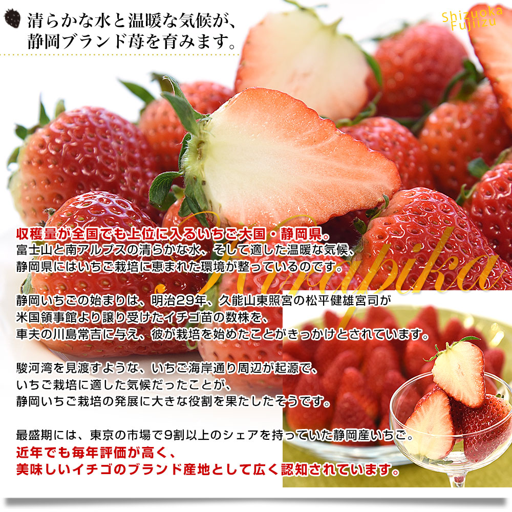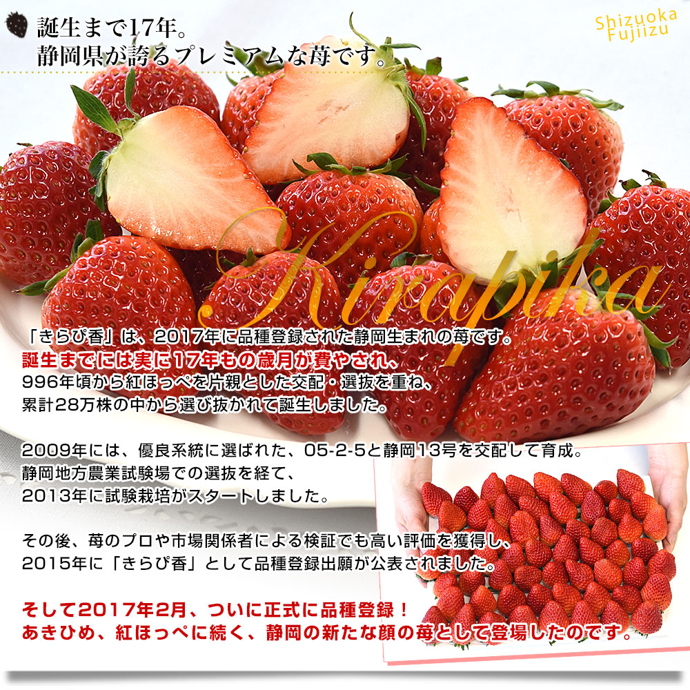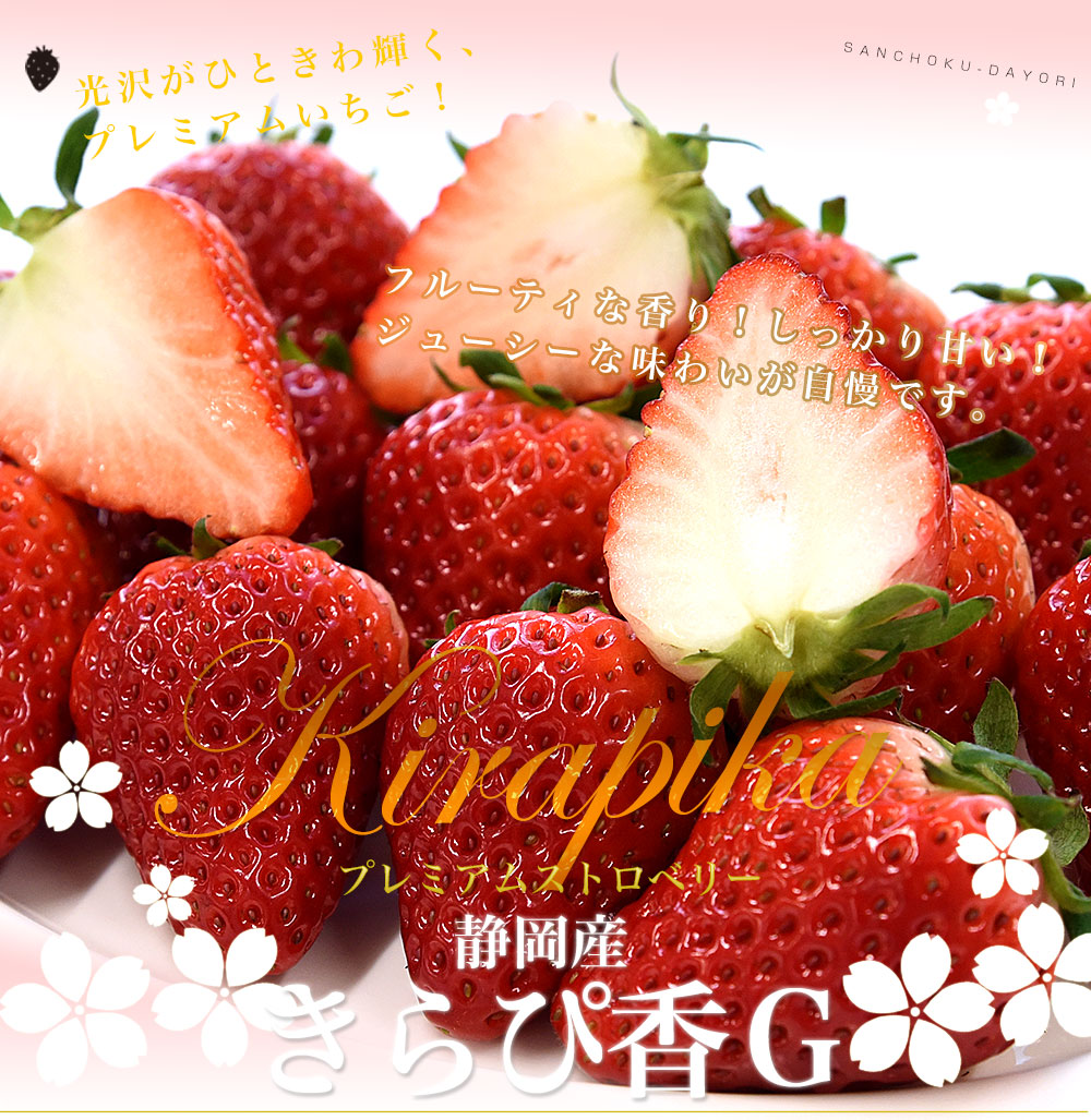 誕生まで実に17年もの歳月が費やされ、2017年に品種登録された静岡生まれの苺「きらぴ香」です。ツヤのある美しい赤色が印象的で、果肉はしっかりとした食感。ひと口かじると、フルーティで上品な香りが鼻に抜け、酸味は控えめ、いちご本来の甘さが際立ちます。果汁もたっぷりで、ジューシーな味わいが楽しめる苺です。