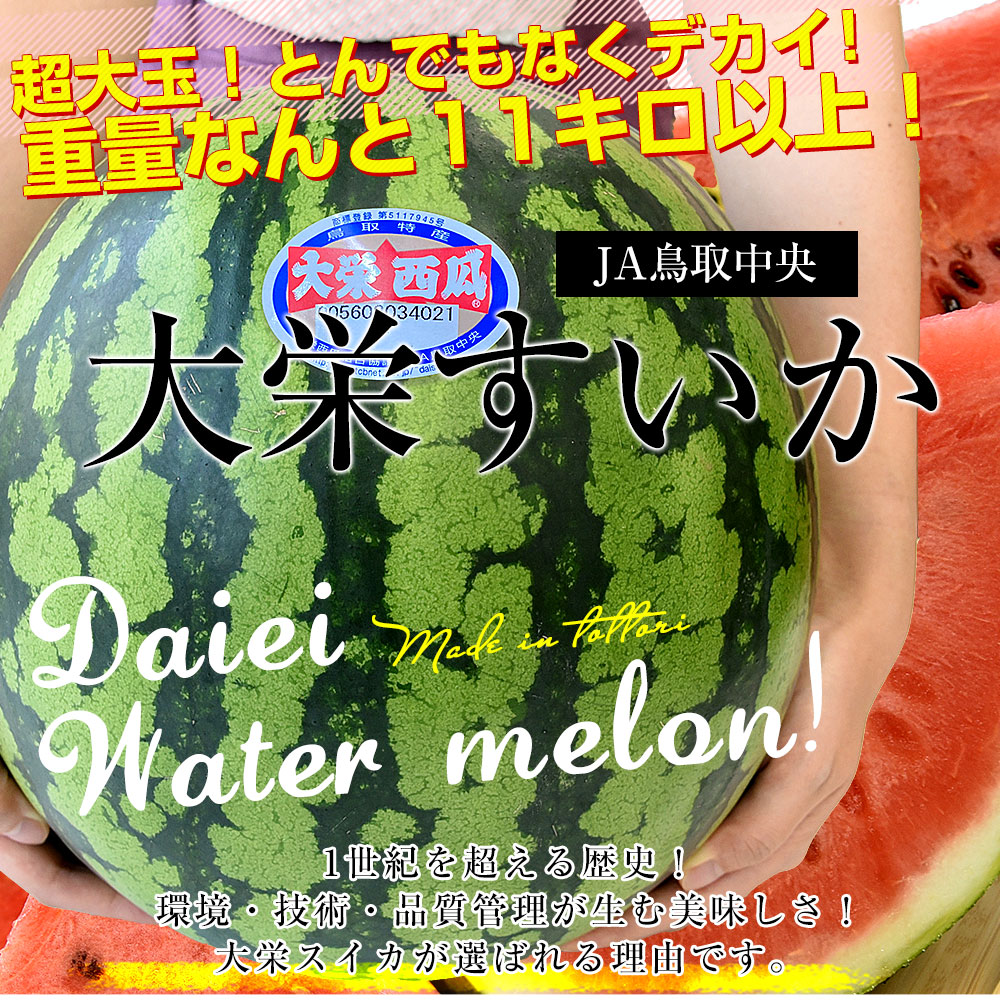 鳥取県の北栄町(旧大栄町)で栽培されている「大栄すいか」。抜群の甘さとシャリ感で、味の評価が高く昔からファンも多い、言わずと知れた大人気のスイカです。100年以上の栽培の歴史がある産地が作る、美味なスイカをご賞味ください。超大玉サイズを厳選してお届けします。
