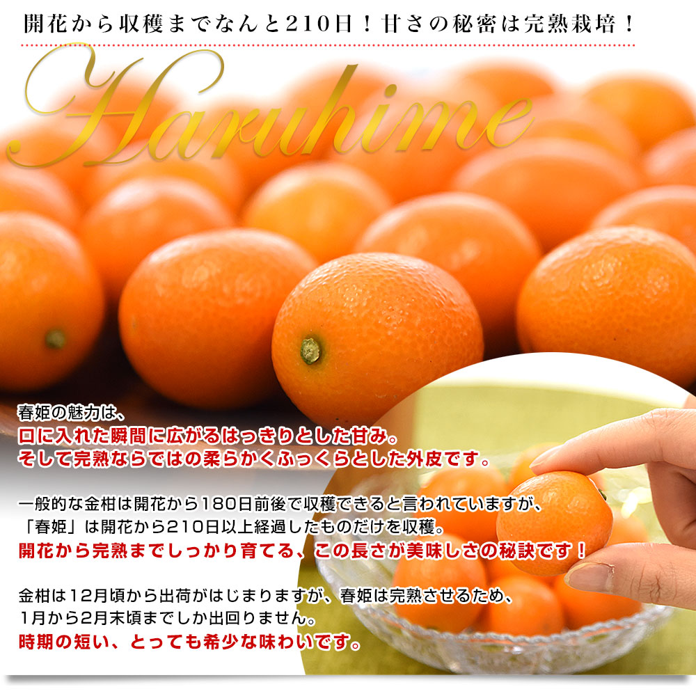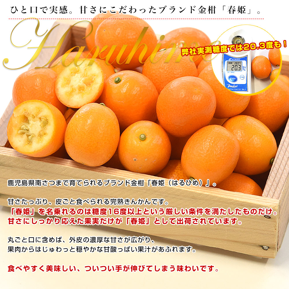 コロッと可愛らしく、皮ごと食べられる甘さたっぷりの金柑です。糖度は16度以上のこだわり品!金柑特有のほのかな苦みと濃厚な甘さが絶妙に絡み合い深みのある味わいです。
