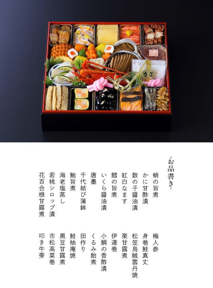 蛸の旨煮、かに甘酢漬、数の子醤油漬、紅白なます、鱈の旨煮、いくら醤油漬、唐墨、千代結び蒲鉾、鮑旨煮、海老塩蒸し、若桃シロップ漬、花百合根甘露煮、梅人参、身巻鮭真丈、松笠烏賊雲丹焼、栗甘露煮、伊達巻、小鯛の香酢漬、くるみ飴煮、田作り、鮭柚庵焼、黒豆甘露煮、市松高菜巻、叩き牛蒡