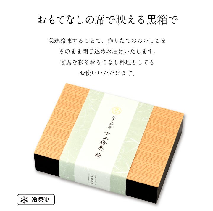 厳選素材を丁寧に仕立てた料理を、12に仕切られた折に詰めました。ひとつひとつに込められた料亭の技と心が、京都ならではの風情と彩りを食卓に届けます。