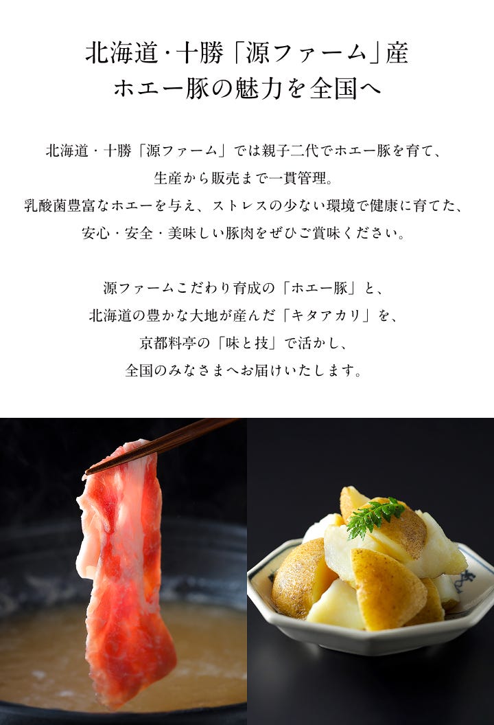 源ファームこだわり育成の「ホエー豚」と、北海道の豊かな大地が産んだ「キタアカリ」を、京都料亭の「味と技」で活かし、全国のみなさまへお届けいたします。