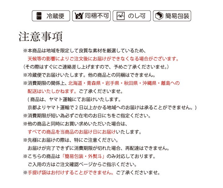 ※消費期限の関係上、北海道・青森県・岩手県・秋田県・沖縄県・離島への配送はいたしかねます。ご了承くださいませ。(商品は、ヤマト運輸にてお届けいたします。京都よりヤマト運輸で2日以上かかる地域へのお届けは承ることができません。)