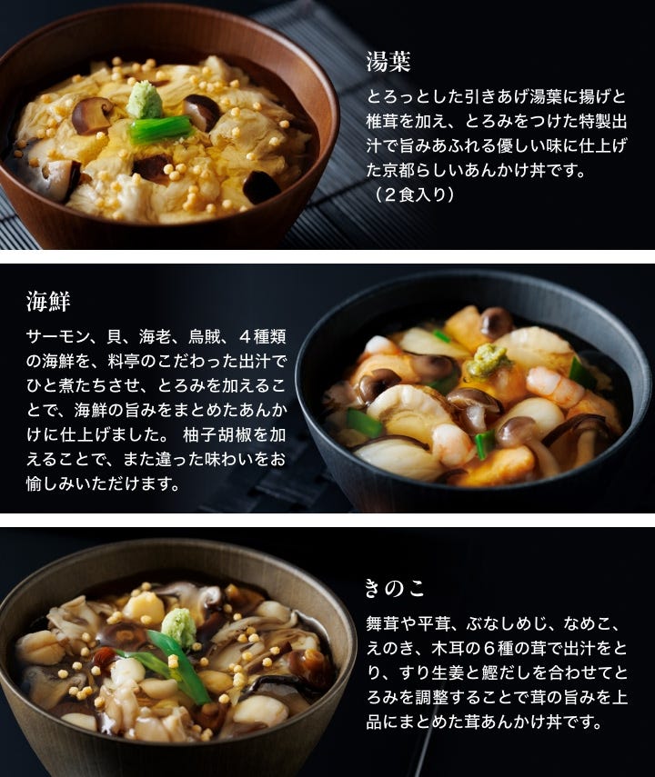 ふわりとした湯葉を使った京都らしい「湯葉餡」、4種の海の幸を詰め込んだ「海鮮餡」、6種の茸の出汁が旨みあふれる「茸餡」をご用意。