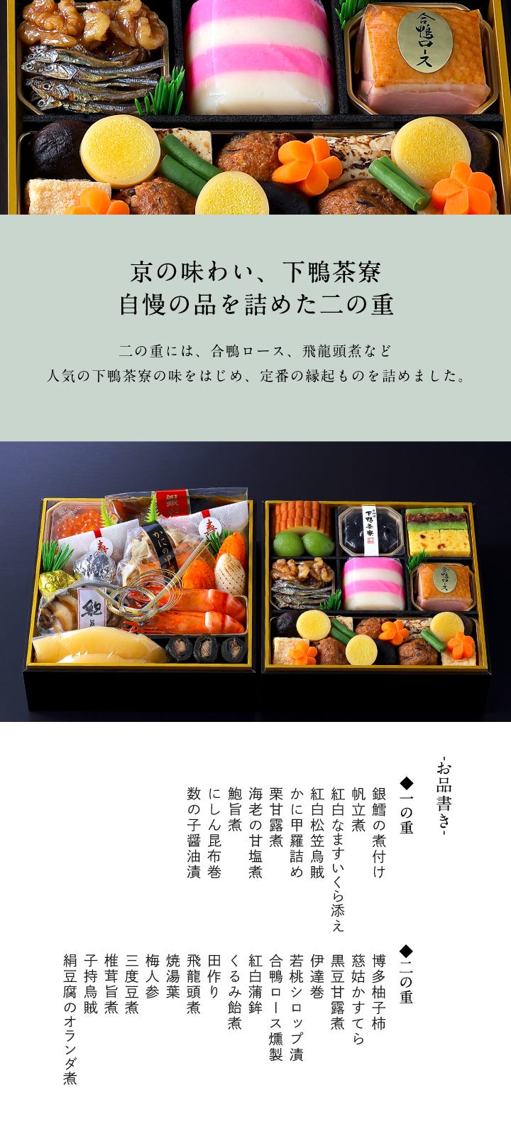 博多柚子柿、慈姑かすてら、黒豆甘露煮、伊達巻、若桃シロップ漬、合鴨ロース燻製、紅白蒲鉾、くるみ飴煮、田作り、飛龍頭煮、焼湯葉、梅人参、三度豆煮、椎茸旨煮、子持烏賊、絹豆腐のオランダ煮