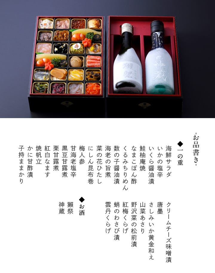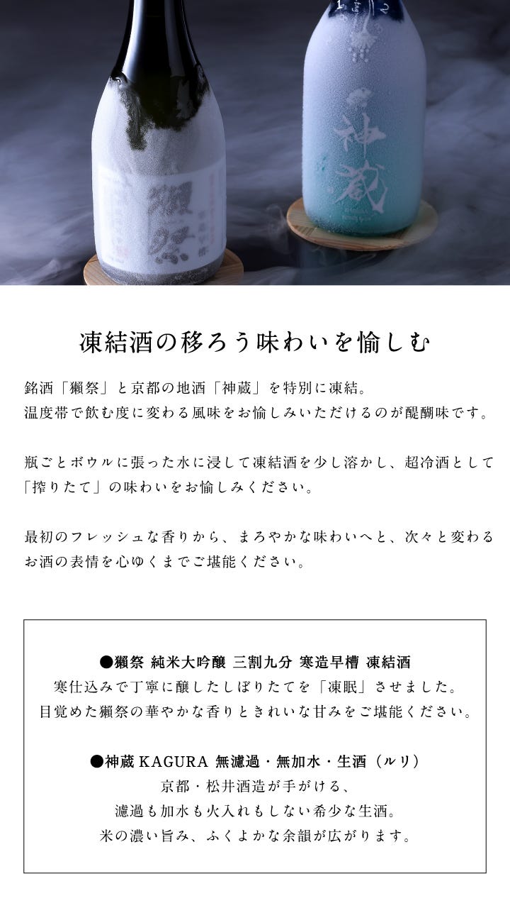 日本酒「獺祭」と京の銘酒「神蔵」を冷凍しました。お酒とともに愉しめる和洋折衷のお料理を詰め合わせた酒肴おせちで、新年をみなさまでお祝いください。