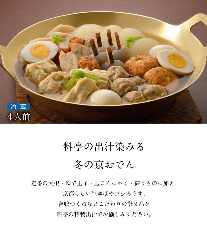 定番の大根・ゆで玉子・玉こんにゃく・練りものに加え、京都らしい生ゆばや京ひろうす、合鴨つくねなどこだわりの計9品を料亭の特製出汁でお愉しみください。