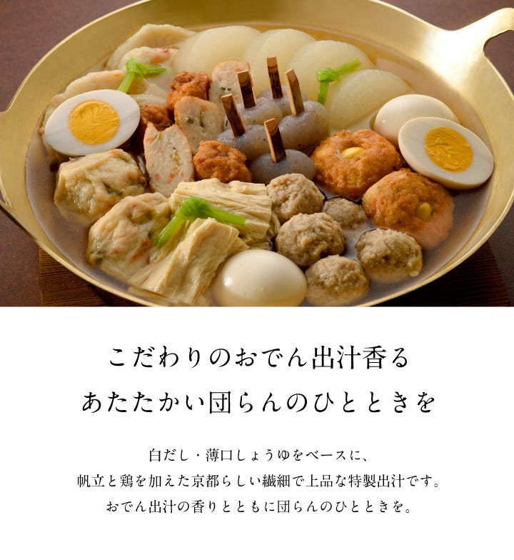出汁は、白だし・薄口しょうゆをベースに、帆立と鶏を加えた京都らしい繊細で上品な特製出汁です。おでん出汁の香りとともに団らんのひとときを。