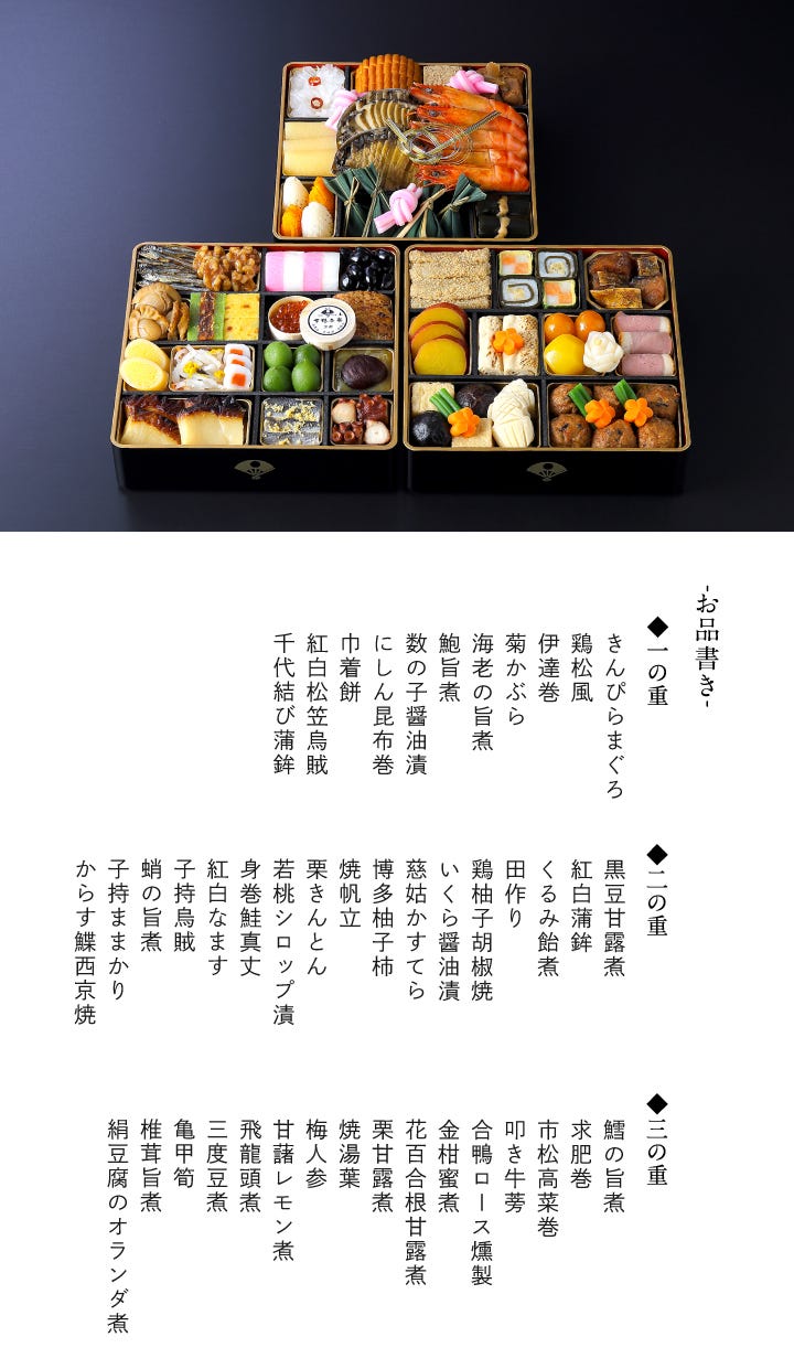 黒豆甘露煮、紅白蒲鉾、くるみ飴煮、田作り、鶏柚子胡椒焼、いくら醤油漬、慈姑かすてら、博多柚子柿、焼帆立、栗きんとん、若桃シロップ漬、身巻鮭真丈、紅白なます、子持烏賊、蛸の旨煮、子持ままかり、からす鰈西京焼