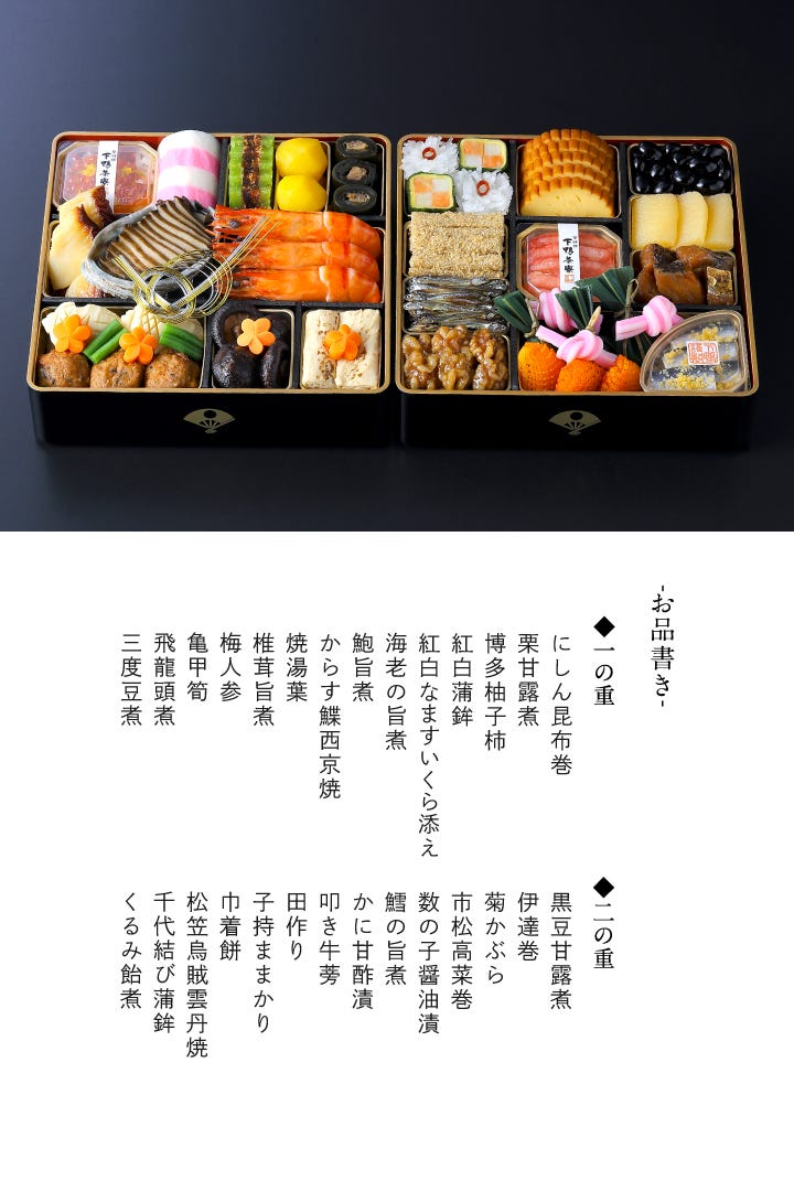 黒豆甘露煮、伊達巻、菊かぶら、市松高菜巻、数の子醤油漬、鱈の旨煮、かに甘酢漬、叩き牛蒡、田作り、子持ままかり、巾着餅、松笠烏賊雲丹焼、千代結び蒲鉾、くるみ飴煮