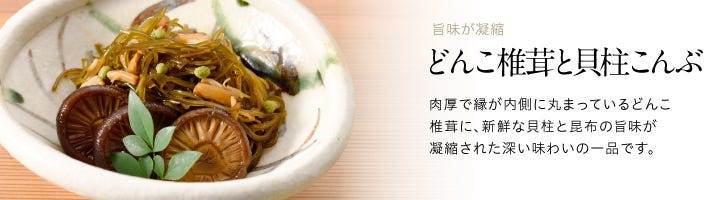 どんこ椎茸と貝柱こんぶは、かさの肉が厚く、味・香り共に抜群な国産どんこ椎茸と、新鮮な貝柱、昆布の旨味が重なる味わい深い逸品です。