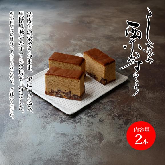 渋皮付の栗をそのまま、蜜につけ込み、黒糖風味のかすてらに焼き上げました。 ※小口切りにはなっておりませんので、ご注意ください。