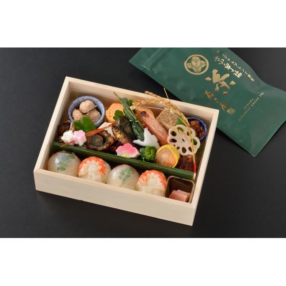 粽麩(抹茶生麩)/細巻/大根甘酢漬け(鶴)/合鴨松風焼/鯛 揚げ煮/花蓮根酢漬け/鯛の子生姜煮/鱒の子南蛮漬け/サーモン錦糸巻/焼き帆立オイル和え/穴子 鳴戸巻/鰻 印籠煮/伏見唐辛子/いくら/胡麻揚げ麩煮/粟麩抹茶射込み/小芋 含め煮/蛸 柔らか煮/小茄子含め煮/あやめ麩煮/菜種辛し和え/鰊 昆布巻/才巻海老 芝煮(有頭)/梅貝 酒煮/絹さや/小梅 甘露煮/梅蒲鉾松葉串/手毬寿司/【鯛・車海老】/甘酢生姜/稲穂/木の芽