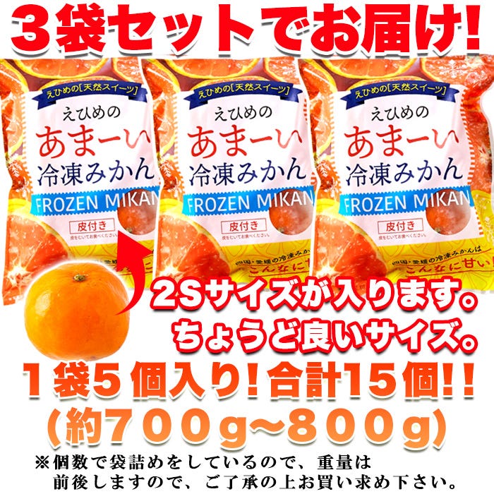 - ■愛媛西宇和の冷凍みかんはこんなに甘い! ■みかんの産地として有名な 愛媛県西宇和産みかん100%使用! アイスを食べるならこっち! 天然のスイーツ!! ■甘くて美味しい!! 愛媛県西宇和産みかん100%! アイス食べるならこっち!天然のスイーツ えひめのあまーい冷凍みかん ■たっぷり! 5個入り(2Sサイズ5個入り)×3袋 大容量15個(約700~800g) ※個数で袋詰めをしているので、重量は前後しますので、ご了承の上お買い求め下さい。 ■あつ~い季節のお楽しみ! アイス食べるならこっち!甘くて美味しい ひんやり美味しい 天然のスイーツ!! ■冷凍みかん ひんやり あま~い 甘くて美味しい理由は!? ■愛媛県西宇和産みかん!! 県西南部に位置する西宇和地域は愛媛を代表するみかんの産地。 温暖な気候で育つみかんは口当たりが繊細で濃厚な甘みが特徴です。 そんな西宇和産みかんを100%使用。 西宇和産のみかんが美味しく育つ理由は 「3つの太陽」にあると言われています! ■3つの太陽 ①空からの太陽 ②海の照り返し ③石垣の反射光 1つめの太陽は「燦燦(さんさん)と降り注ぐ空からの太陽」。 2つめは「地元の豊かな海“宇和海”の海面からの照り返し」。 そして、3つめが「みかん畑に積まれた石垣に反射する光」。 これらの太陽をいっぱいに浴びて美味しく育ちます! ■うまいっ!ひんやり!ジュワ~ジュワ~ あま~い! 皮が薄い!皮付きだから、香りも楽しめる! ■美味しい解凍方法! 半解凍がおすすめ! 流水解凍:約5~10分 自然解凍:常温で約30~50分程度 ※気温等により解凍時間は異なります。 ■3袋セットでお届け! 2Sサイズが入ります。 ちょうど良いサイズ。 1袋5個入り!合計15個!!(約700g~800g) ※個数で袋詰めをしているので、重量は前後しますので、ご了承の上お買い求め下さい。 ■西宇和産の冷凍みかん! 甘くて美味しい! 是非、一度ご賞味下さい! ■愛媛西宇和の冷凍みかんはこんなに甘い! ■みかんの産地として有名な 愛媛県西宇和産みかん100%使用! アイスを食べるならこっち! 天然のスイーツ!! ■甘くて美味しい!! 愛媛県西宇和産みかん100%! アイス食べるならこっち! 天然のスイーツ えひめのあまーい冷凍みかん ■たっぷり