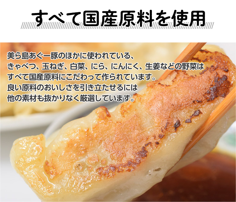 【原材料】豚肉(沖縄県産)、野菜(キャベツ、たまねぎ、白菜、にんにく、にら、生姜)、醤油、食塩、調合ごま油、香辛料、酢、皮(小麦粉、食塩、油)/増粘剤(加工デンプン)、調味料(アミノ酸)、トレハロース、酒精、(一部に小麦・大豆・ごま・豚肉を含む))
