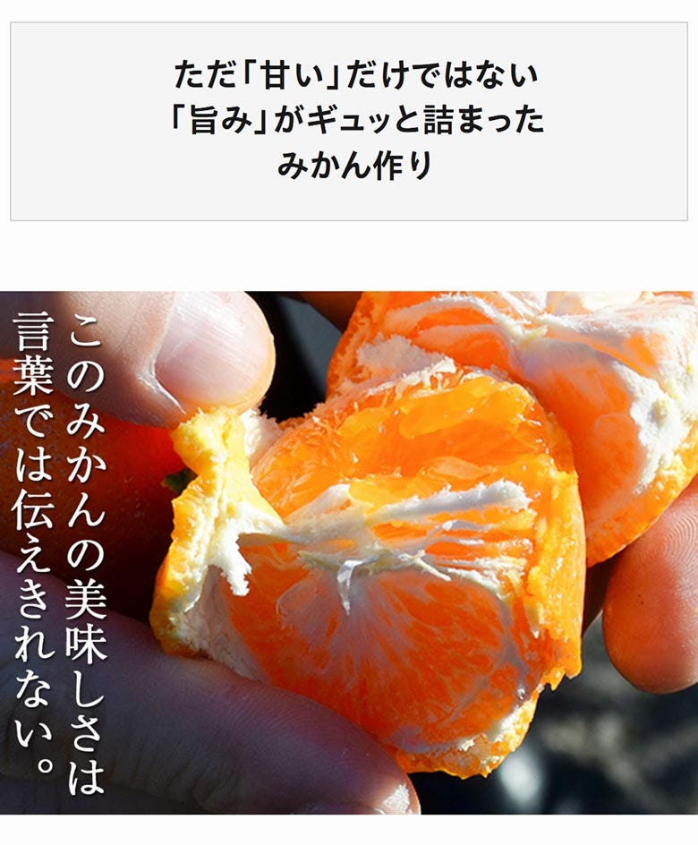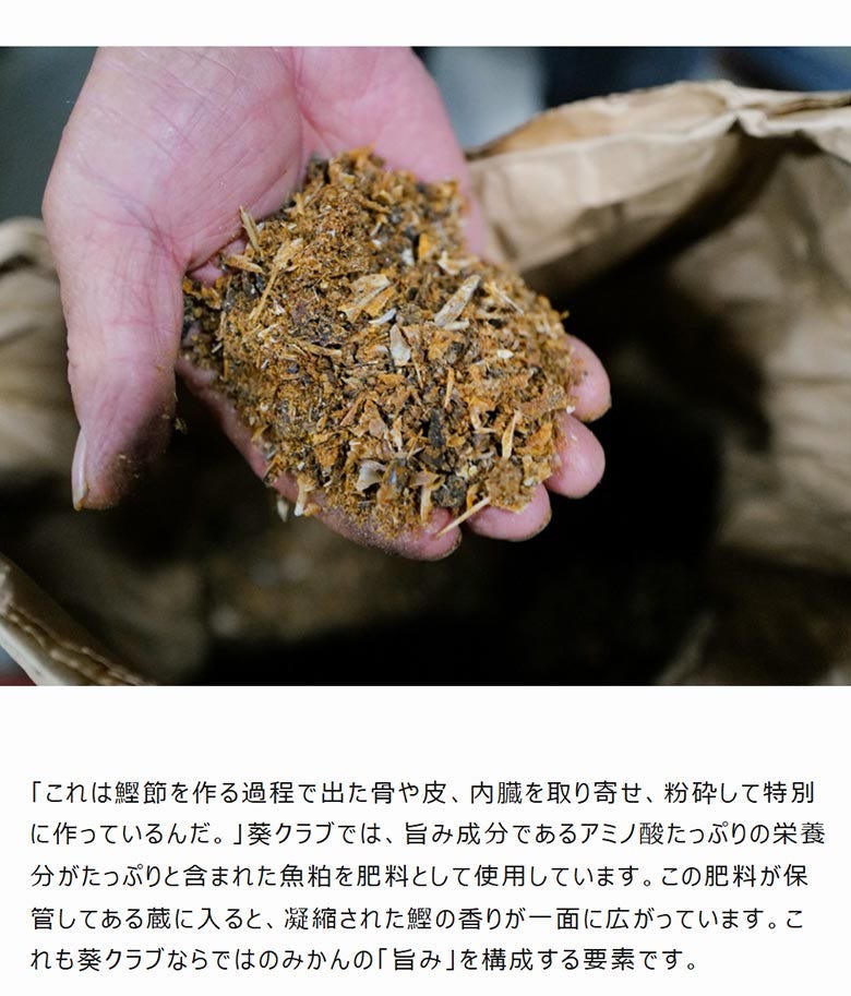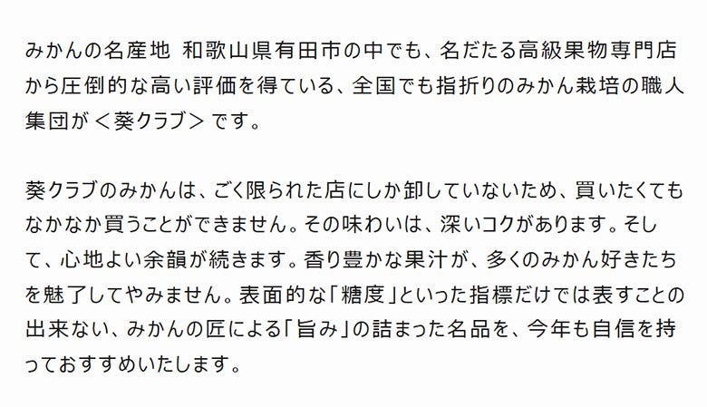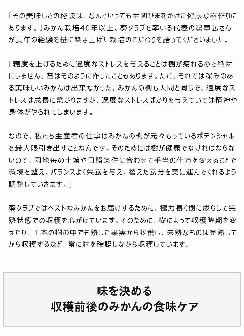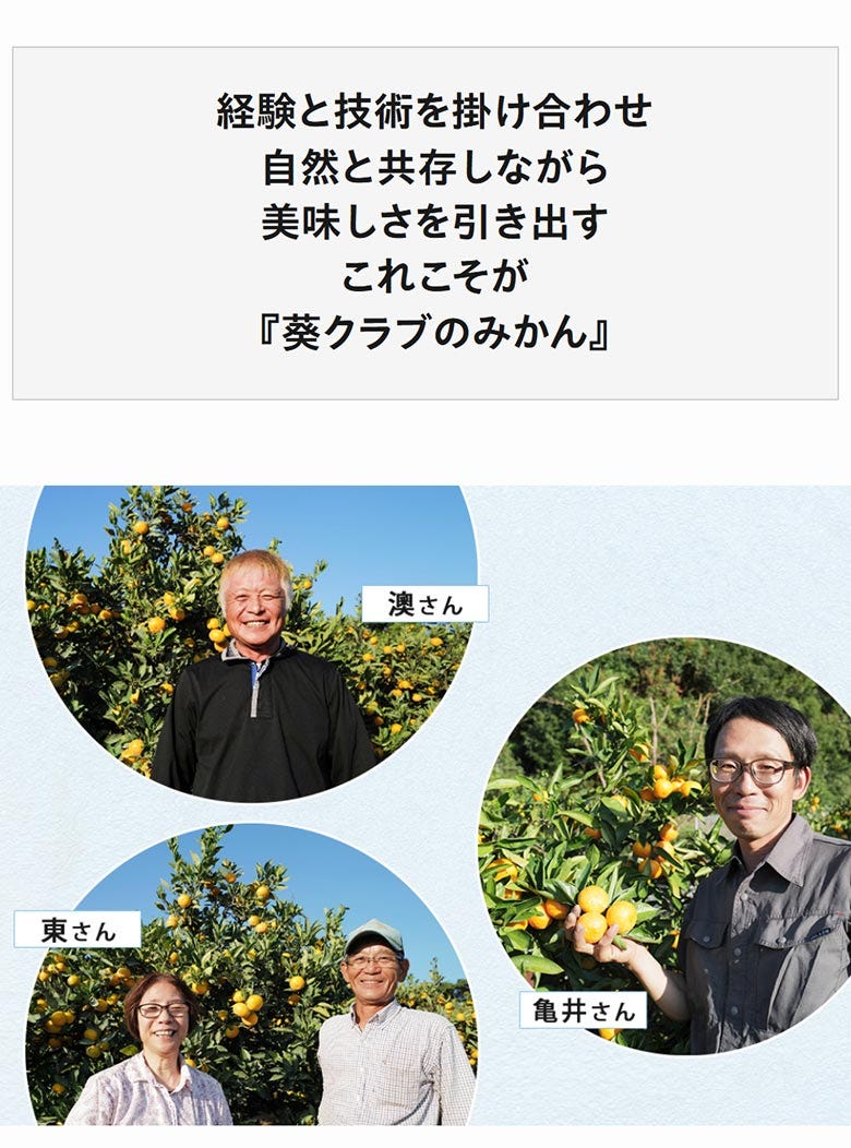 栽培の全工程でみかん本来の旨みを引き出すことを考えて、手間ひまを惜しむことなく作られた『葵クラブのみかん』は、甘さとコクのある濃厚な味わいで、口の中に余韻が残る一味違ったコダワリの蜜柑。