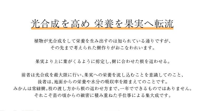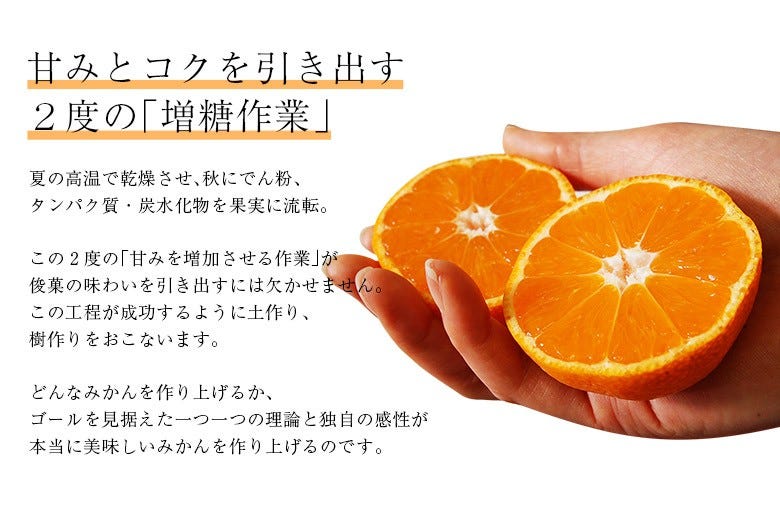 こうした、2度の増糖・熟成期間を長くすることにより「甘さ&コク」を併せもつ、今までにないみかんを生み出します。