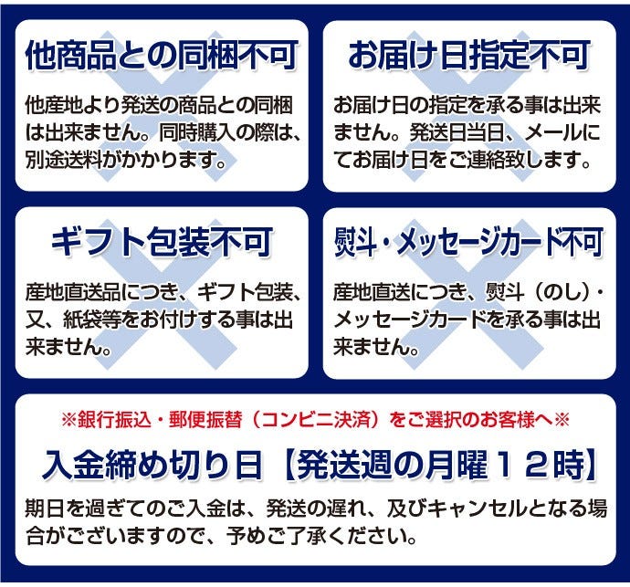 ・返品、交換は商品到着後、原則翌日までにご連絡をお願い致します。 ※品質につきましては、発送前に検品をし万全を期しておりますが、商品到着後すぐに商品のご確認をお願い致します。 ※ご不在等により到着日が遅れた場合は、対応でき兼ねる場合もございます。予めご了承の程お願い致します。 ◆商品保証の条件 ・商品が『破損』している場合、または当店の手違いで『違う商品が届いた』場合に、商品を交換させて頂きます。 ※収穫の確認等に時間を要し、お届けに 1週間程度かかる場合もございます。予めご了承の程お願い致します。 ※交換商品がご用意できない場合(シーズン終了等)は、ご返金もしくは代品での対応とさせて頂きます。