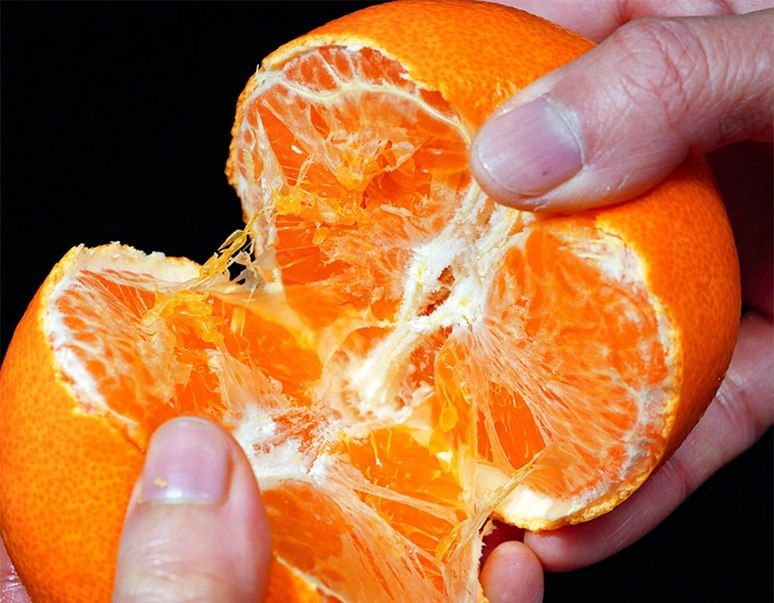 薄い皮を剥くと果汁がたっぷり詰まった果肉が現れ、内皮は剥がす際にちぎれてしまうほど薄いです。