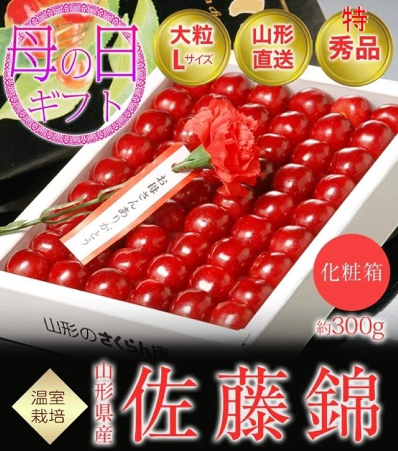 - セット内容:母の日ギフト 佐藤錦 山形県産 温室さくらんぼ Lサイズ 特秀品 約300g 化粧箱 カーネーション(造花)・メッセージカード付