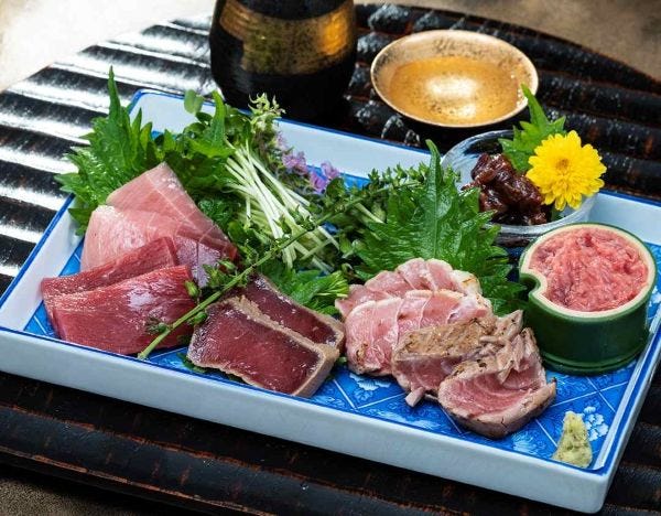 本マグロ・インドマグロ・メバチマグロといった3種の漬けと炙り、弾力を持つ希少部位「目下肉」をつかった本マグロのユッケや血合いの煮付けなど、贅沢にひと手間加えた味覚が詰まっています。