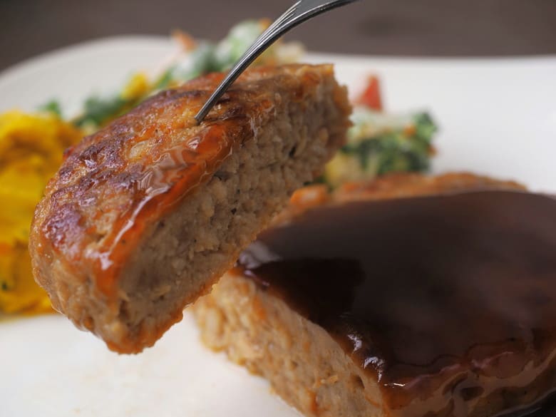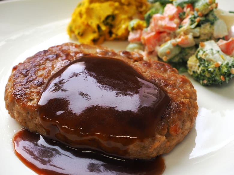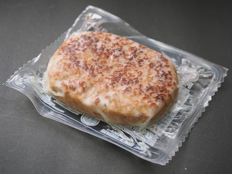原材料:食肉(牛肉、鶏肉、豚肉)、たまねぎ(中国)、牛脂、つなぎ(パン粉、でん粉、粉末状植物性たん白、卵白、全卵)、粒状植物性たん白、ぶどう糖果糖液糖、ビーフエキス調味料、しょうゆ、食塩、香辛料/カラメル色素、 調味料(アミノ酸等)、(一部に小麦・卵・乳成分・牛肉・大豆・鶏肉・豚肉を含む)