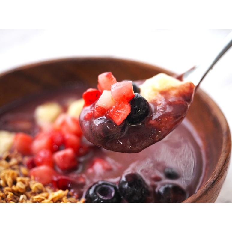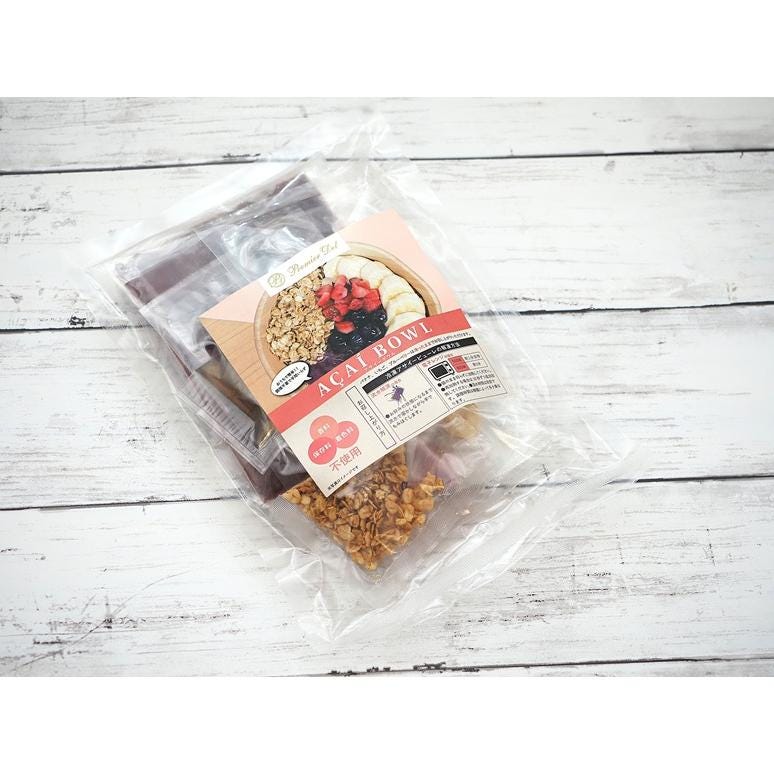 アサイーボウルキットは、アサイーのピューレ、バナナ、イチゴとブルーベリー、グラノーラ、はちみつを1食分にしてお届けします。アサイーピューレを流水やレンジで解凍し、付属の果物やグラノーラをトッピングするだけです。よく混ぜてお召し上がりください。