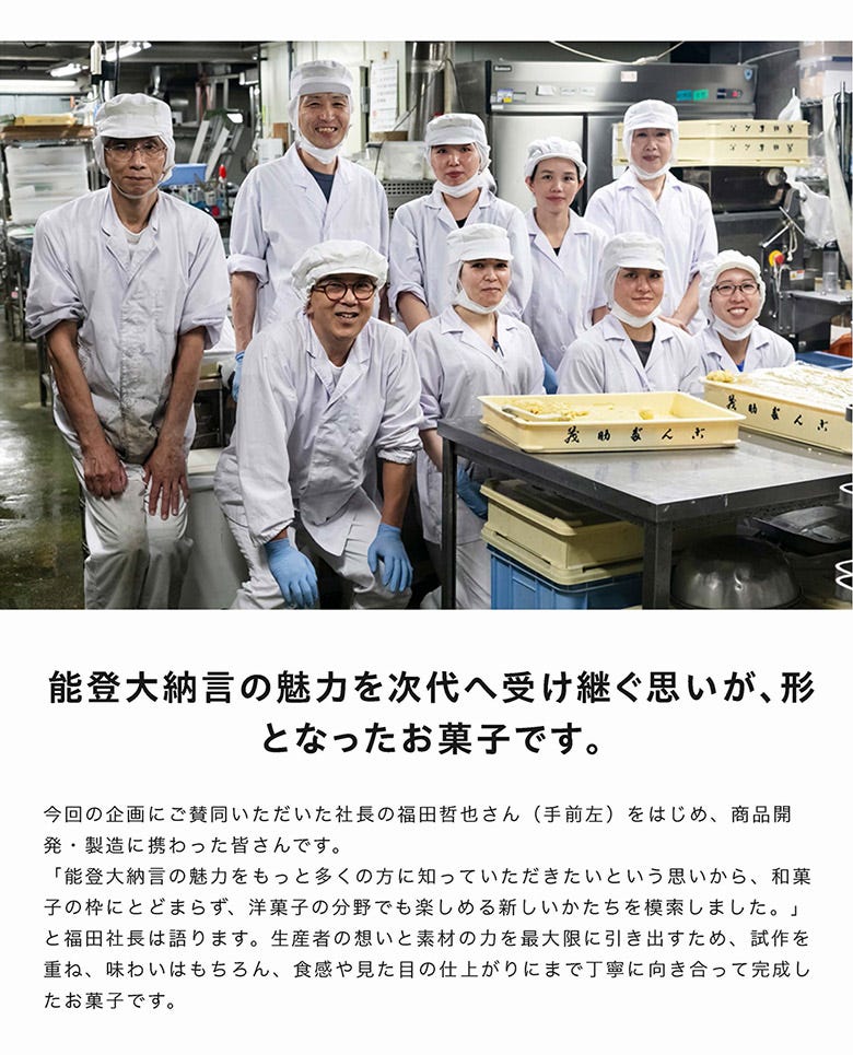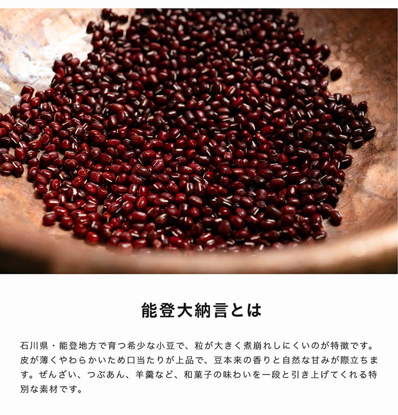 石川県珠洲市の前田広光さんが栽培する能登大納言は、ふっくらと炊き上がり、艶が良く、豆の旨みが濃いのが特徴。石川県のブランド「百万石の極み」に認定される上質な素材です。その魅力を引き立てるため、宇治抹茶の深い香りと上品なほろ苦さを合わせ、しっとり食感に焼き上げました。