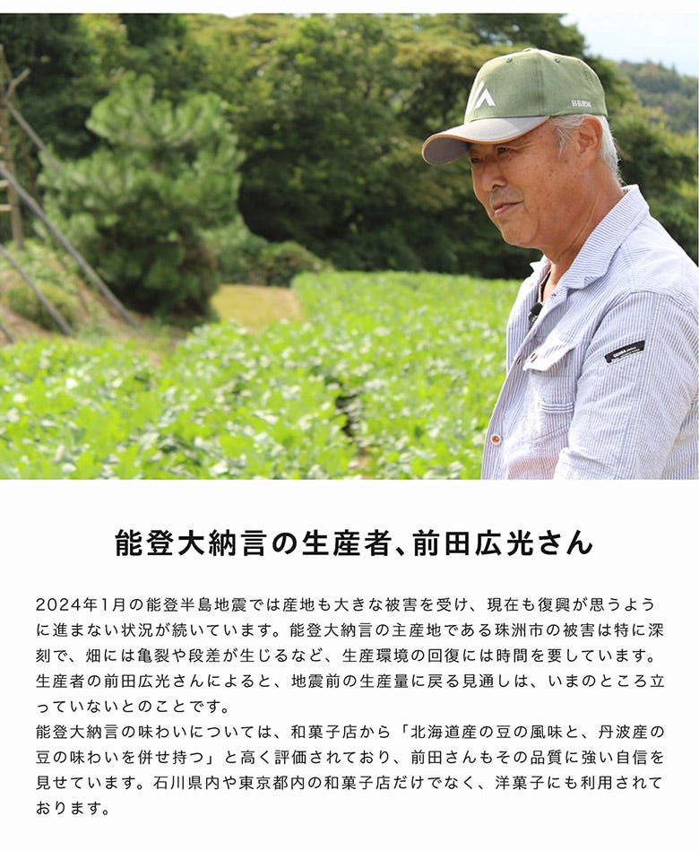 2024年1月の能登半島地震により、能登大納言の主産地・珠洲市も大きな被害を受けました。畑の亀裂や地盤の段差など、生産環境の回復には時間を要しており、生産量は震災前の水準にはまだ戻っていません。 被災した産地を応援したい。そんな思いから実現した茂助だんごと能登大納言のコラボ企画。 能登大納言の美味しさと、職人の丁寧な仕事が詰まったお菓子です。