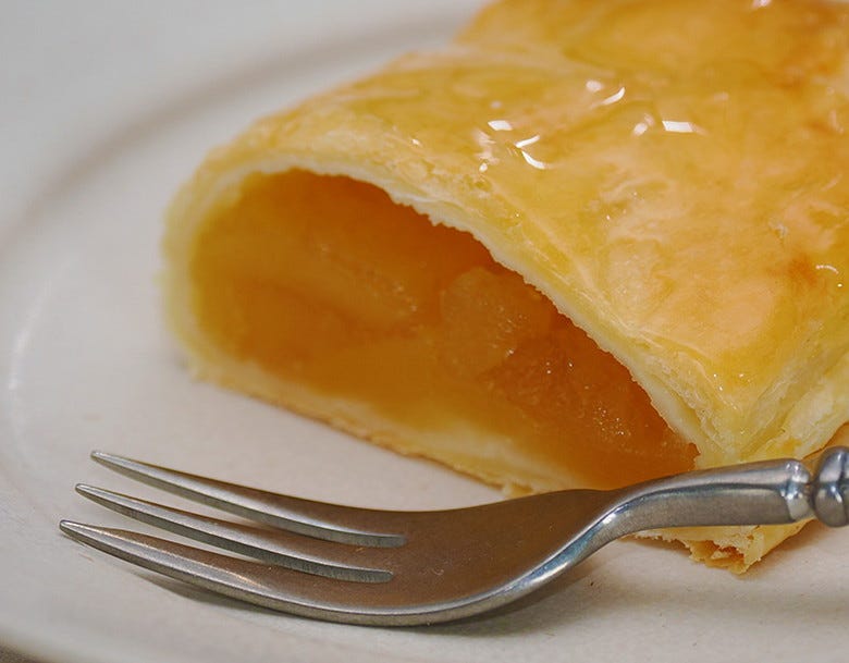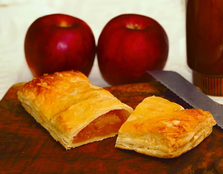 原材料:パイ生地(小麦粉、マーガリン、その他)、(国内製造)、りんごプレザーブ、(りんご(北海道産)、ぶどう糖果糖液糖、砂糖)、りんごジャム(りんご(国産)、あんずジャム(水あめ、あんず、砂糖)/糊料(増粘多糖類、加工でん粉、酸味料、香料、乳化剤、pH調整剤、乳酸カルシウム、酸化防止剤(V.C、V.E)、アナート色素、(一部に小麦・乳成分・大豆・りんごを含む)