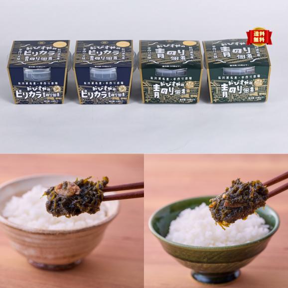 ニンジンとイカ、ゴボウに一味唐辛子を効かせた「ピリカラ」と、ボイルしたアサリがゴロゴロ入った「アサリ入り」の2種の佃煮はどちらもたっぷりのヒトエグサをお愉しみいただけます。