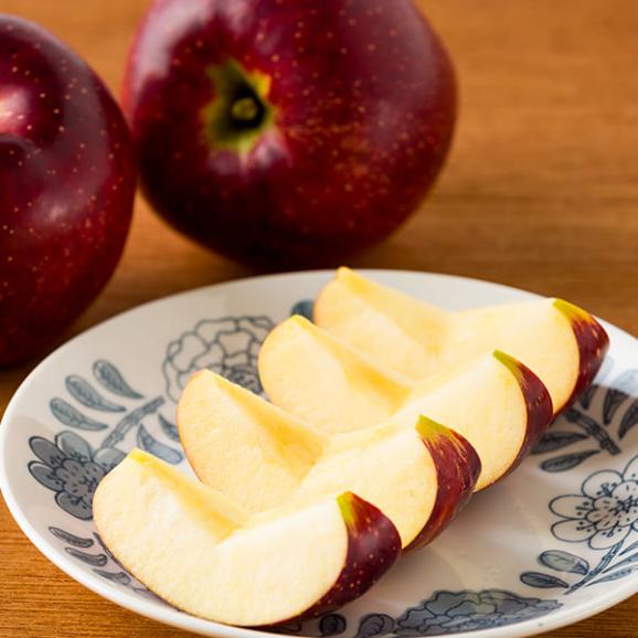 濃い紅色の果皮が特徴です。果肉はやや硬めで、パリっとした食感と、甘味と酸味のバランスの良さ、そして果汁もたっぷりのりんごです。程よい甘酸っぱさで、りんごらしい味わいがお楽しみいただけます。