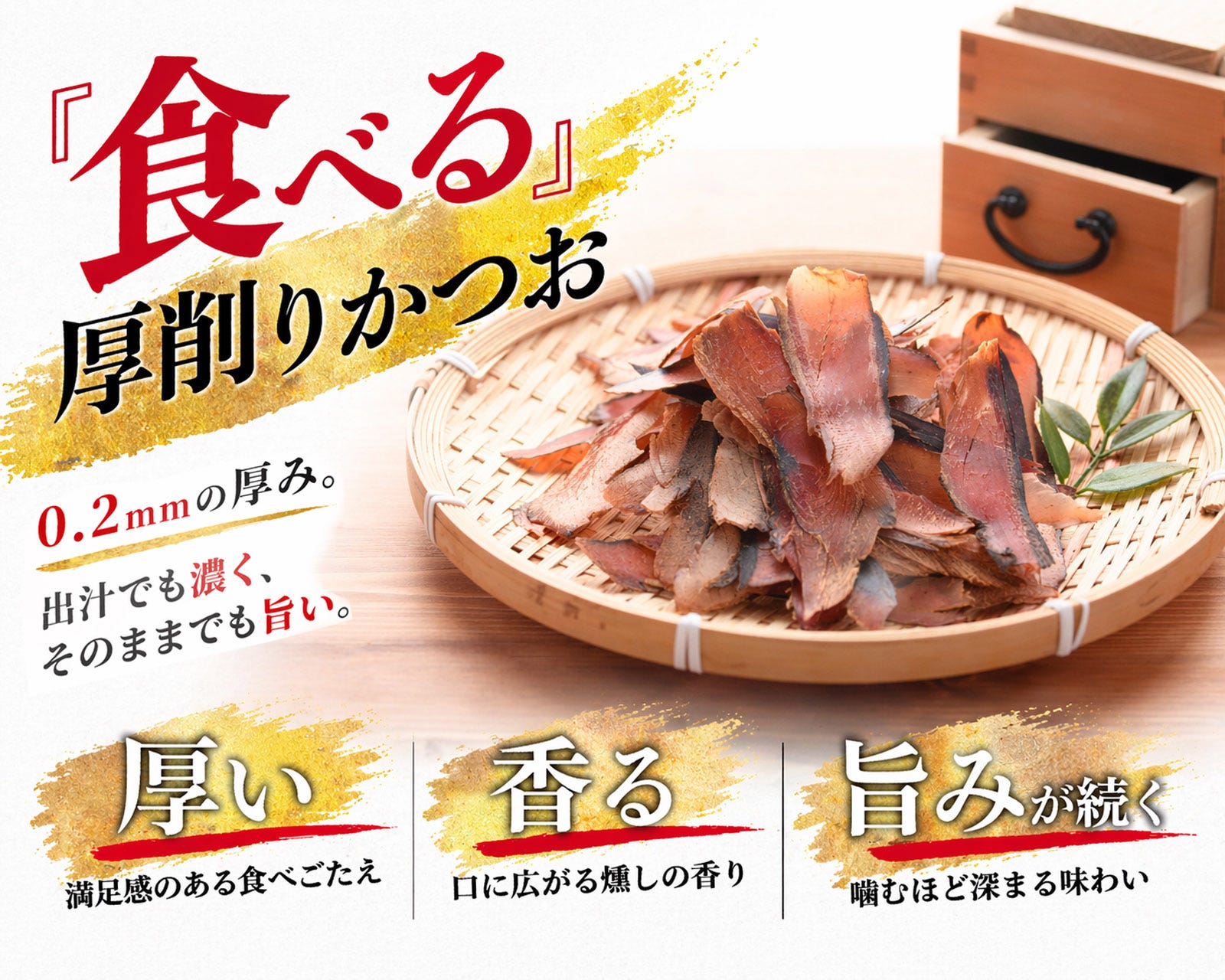 一般的なかつお節とは異なり、0.2mmの厚削りにすることで、噛むほどに鰹の旨味と香りが口いっぱいに広がります。