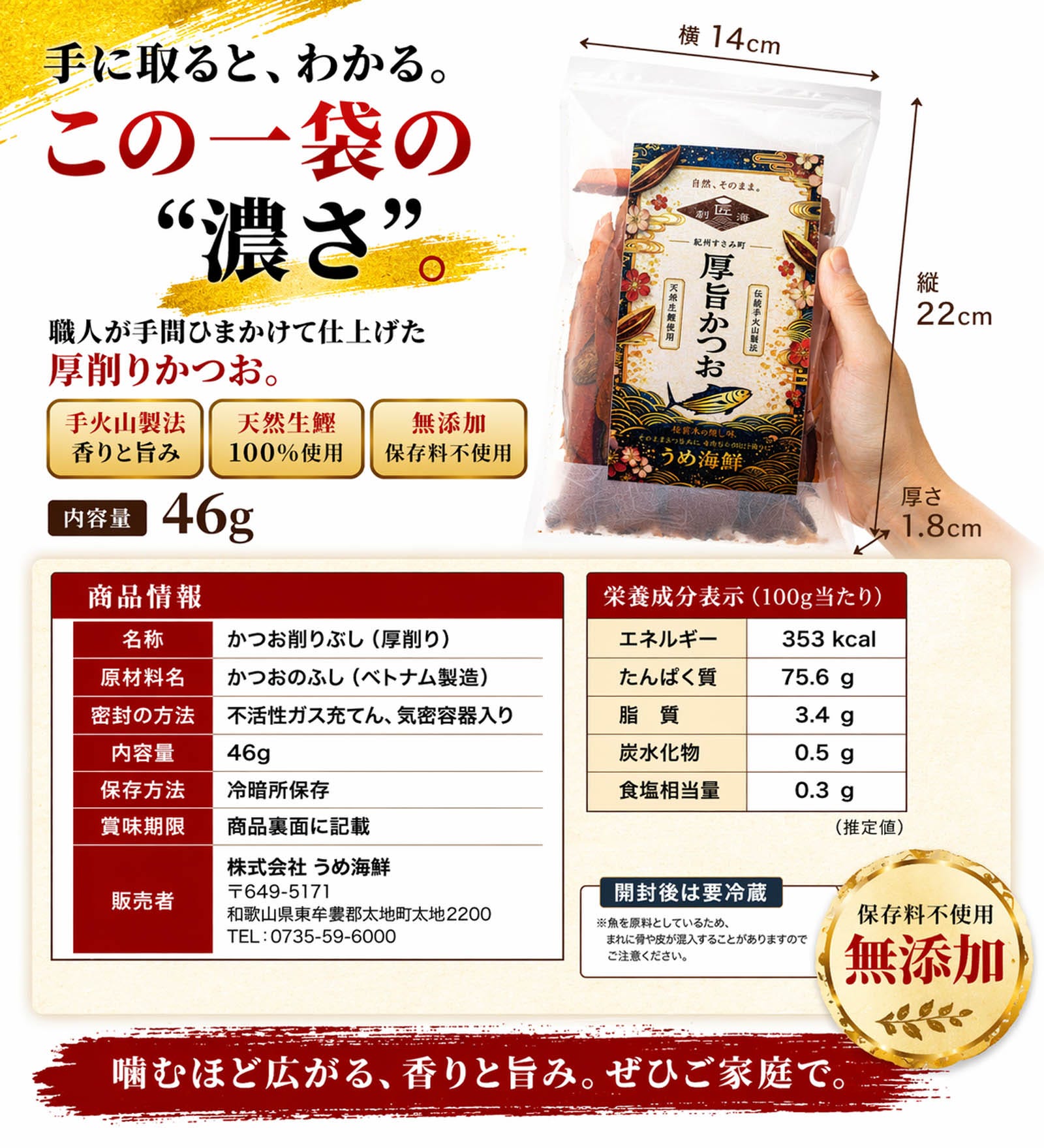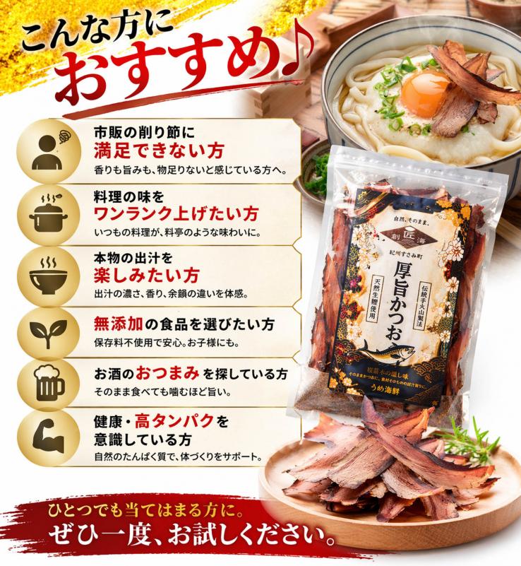 原材料は鰹のみで、保存料や添加物は一切不使用。無添加だからこそ、素材本来の自然な味わいを安心してお楽しみいただけます。
