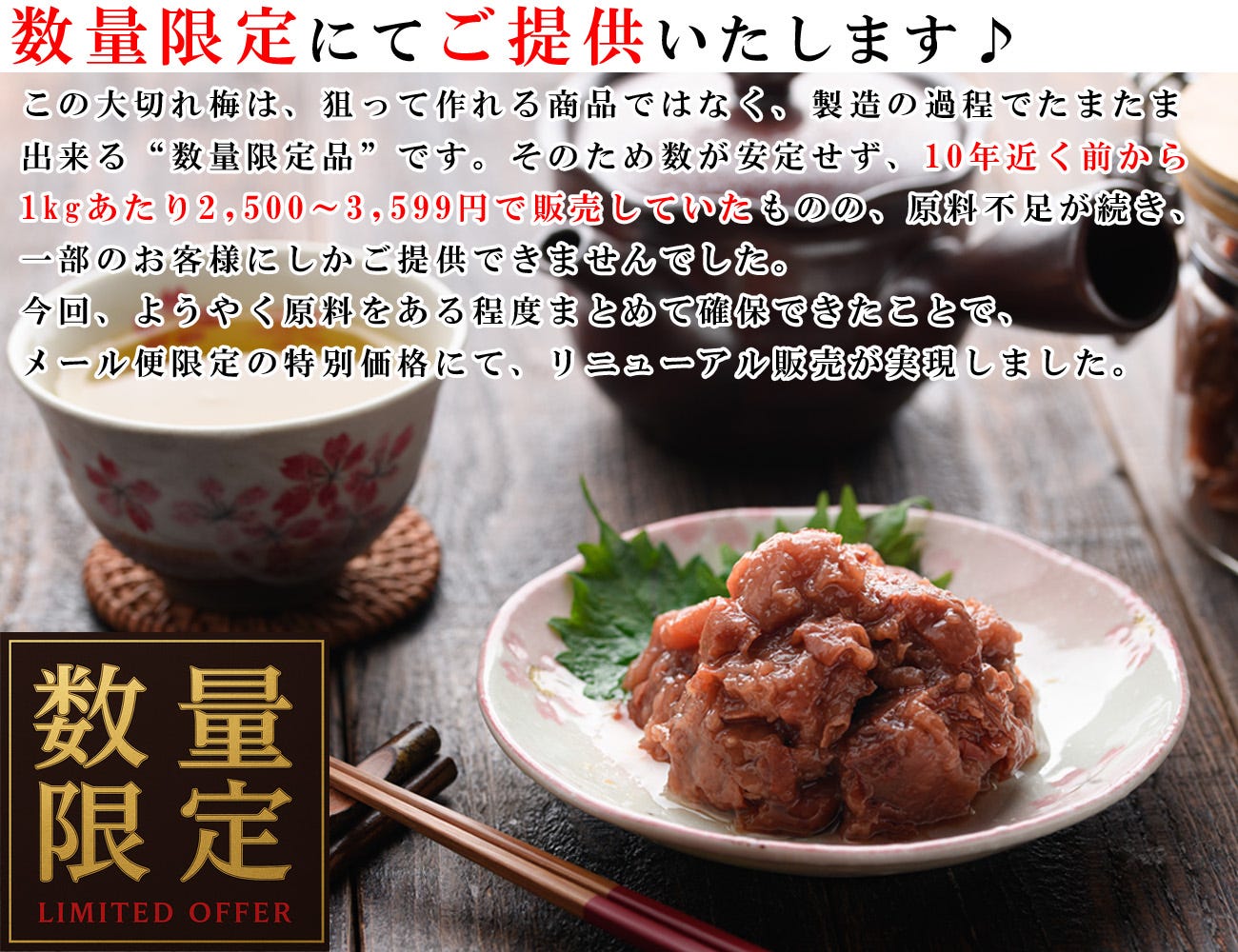 この大切れ梅は狙って作れる商品ではなく、数量が安定しないため常時販売できない“限定品”。 10年近く前から1kgあたり3,000~3,599円で販売していましたが、原料が不足し、一部の方にしかご提供できていませんでした。 今回、原料をある程度確保できたことで、メール便の特別価格でリニューアル販売 が実現しました!