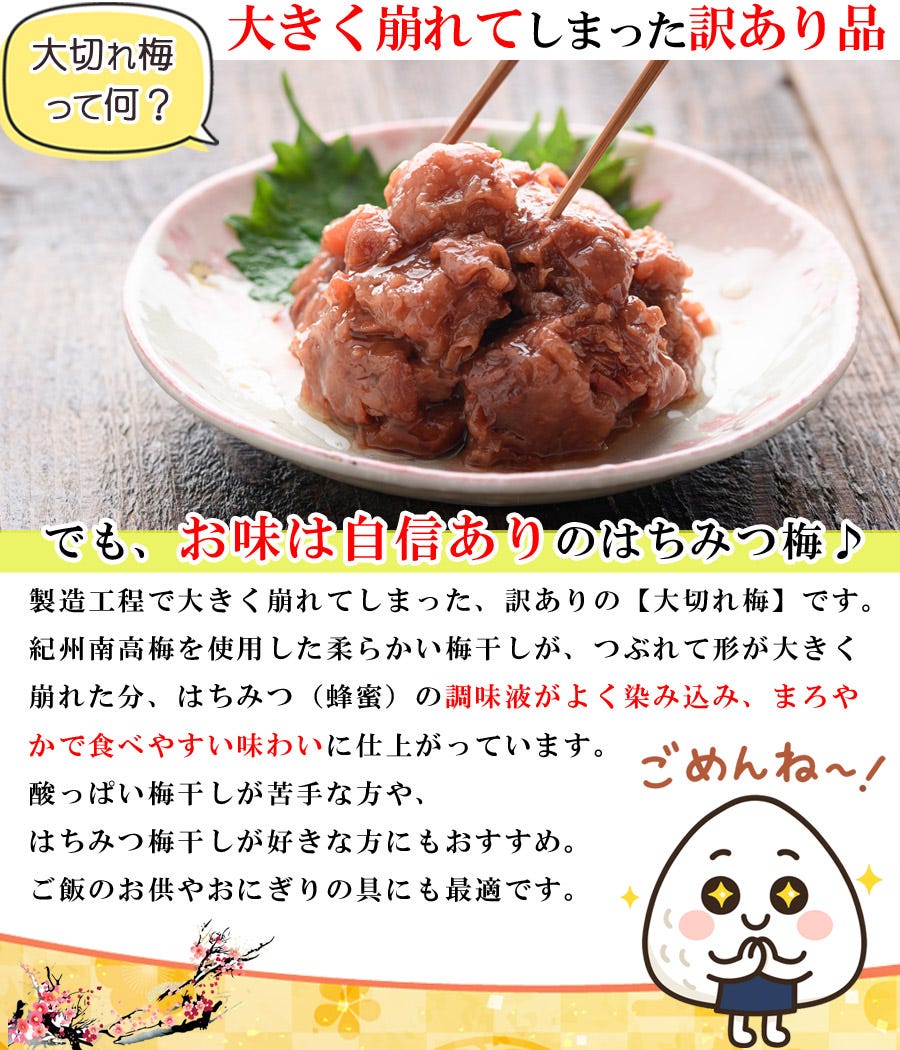 「めちゃくちゃ潰れてごめんなさい!」でも、お味は自信ありのはちみつ梅♪ 製造工程で大きく崩れてしまった、訳ありの【大切れ梅】です。 紀州南高梅を使用した柔らかい梅干しが、つぶれて形が大きく崩れた分、はちみつ(蜂蜜)の調味液がよく染み込み、まろやかで食べやすい味わいに仕上がっています。 酸っぱい梅干しが苦手な方や、はちみつ梅干しが好きな方にもおすすめ。ご飯のお供やおにぎりの具にも最適です。