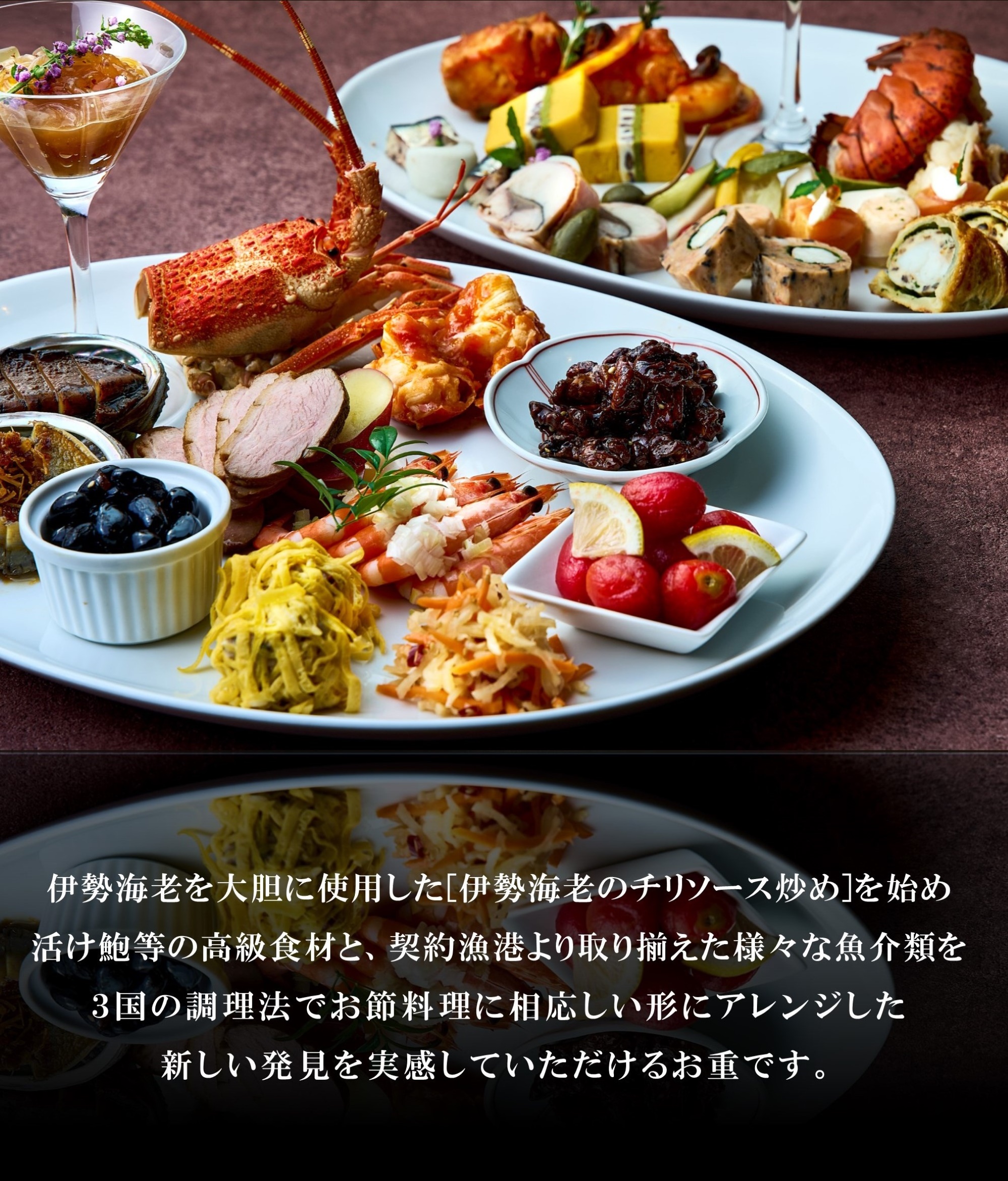 伊勢海老のチリソース煮込み/有頭海老の塩水漬け 葱ソース/姿鮑 オイスターソース煮 自家製XO醤ソース和え/鴨肉の香料煮 鳴門金時の甘煮添え/錦糸卵の焼売/クラゲの酢の物和え/胡桃の飴炊き/トマトのコンポート 桂花陳酒風味/中華風二色なます/丹波の黒豆中華煮