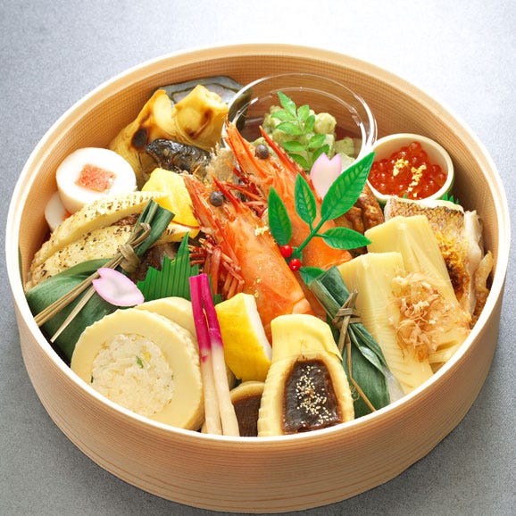〔具材〕竹の子(土佐煮、田楽、木の芽焼、味噌漬、姿ずし、木の芽和え、天ぷら)(京都産)、えび、甘鯛(塩焼)(国産)、鯛、鮎鞍馬煮、魚肉すり身(たら、はも)、麩饅頭、いか黄味焼、ひらめ龍皮巻、いくら、サーモン、はじかみ、じゃがいも、ケシの実、その他 酒、砂糖、しょうゆ、みりん、鰹節、鯖節、昆布、食塩 / 調味料(アミノ酸等)、酸味料、トレハロース、着色料(赤106、青1、カロテン) (一部に えび、小麦、卵、乳製品を含む)